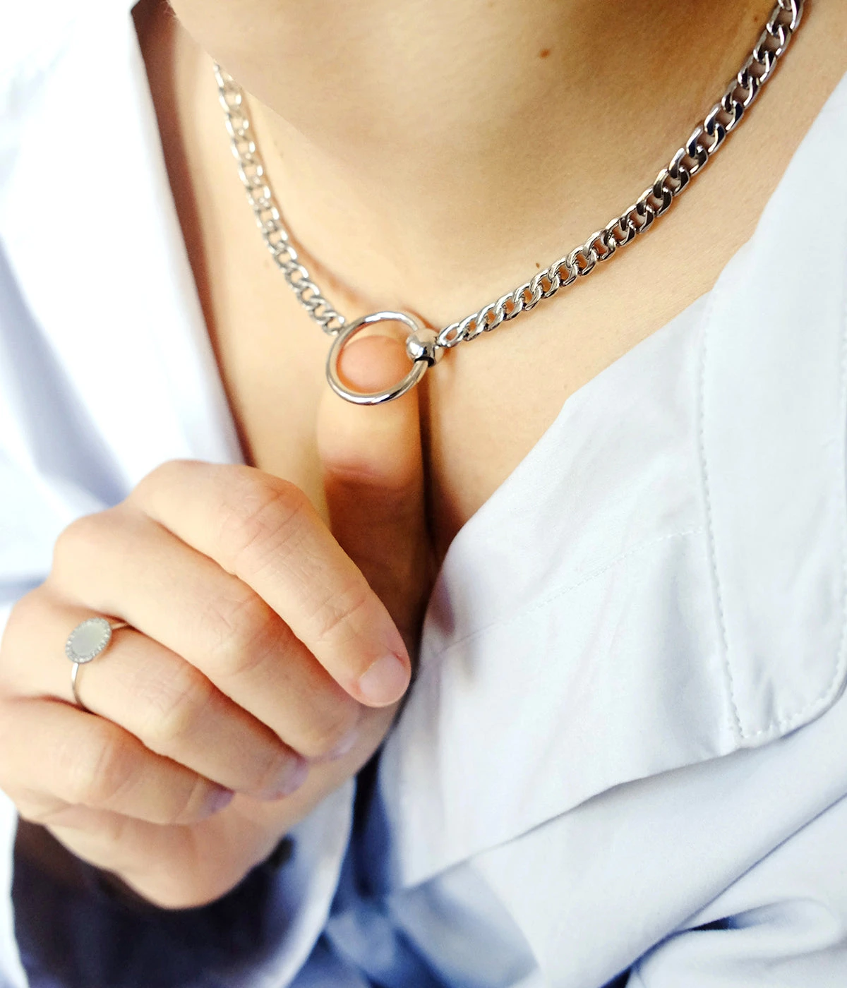 Collier chaĂźne « gourmette » en acier uni ou dorĂ© Ă lâor fin sur lequel est attachĂ© un cercle de mĂ©tal.