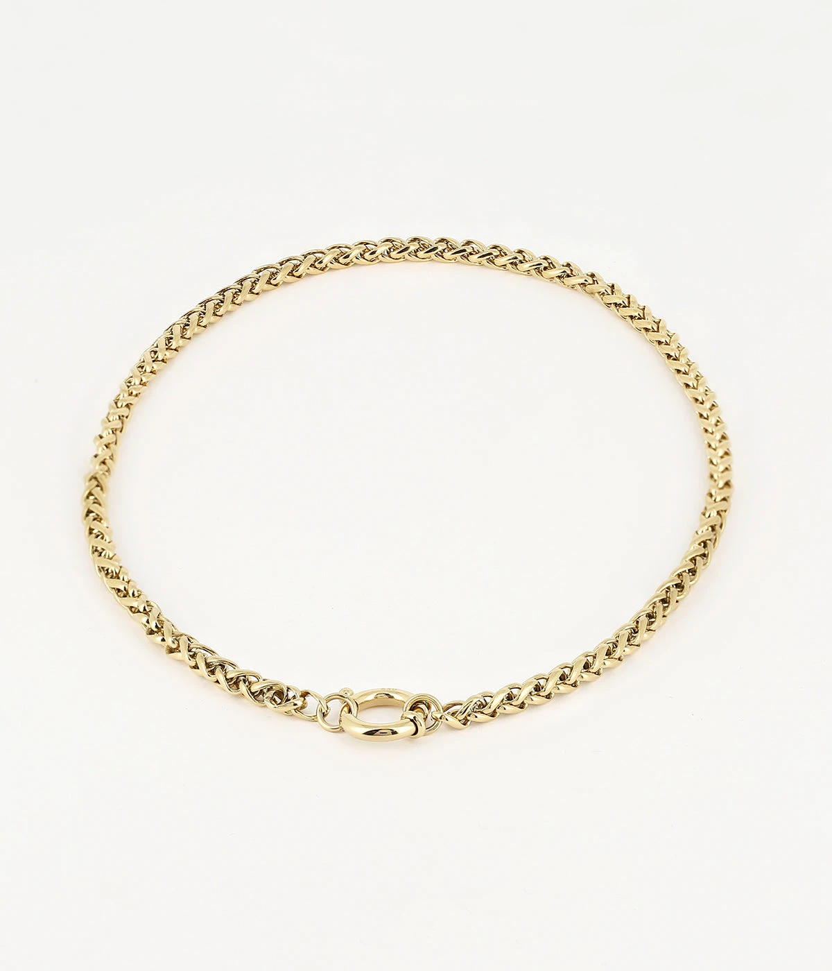 Collier en acier uni ou dorĂ© Ă l’or fin, en maillons, dĂ©corĂ© d’un anneau au niveau du fermoir.