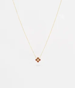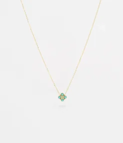 Collier en acier dorĂ© Ă l’or fin sur lequel est suspendu un motif fleur en pierres naturelles et serti d’un zirconium en son centre.