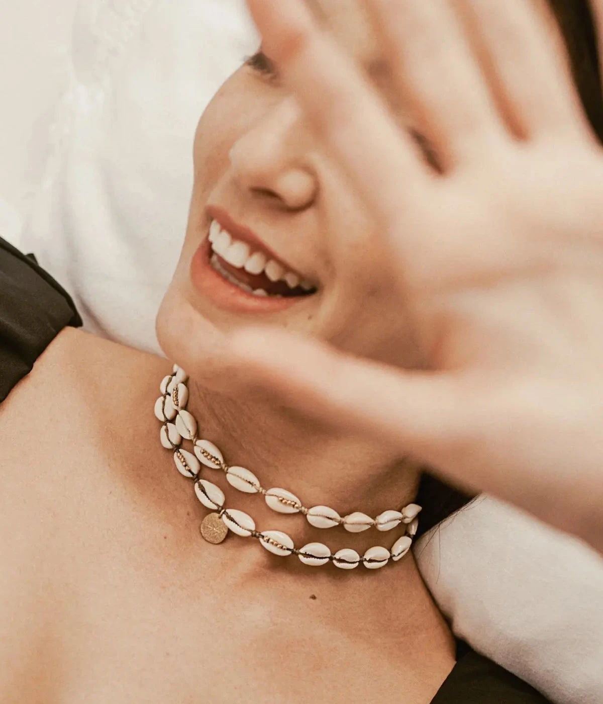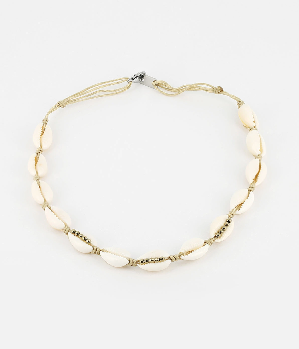 Chocker ajustable en acier dorĂ© et coquillages naturels. MontĂ© sur un cordon de coton et terminĂ© d’une pastille dorĂ©e Ă l’or fin, dont le centre est serti d’un petit zirconium.