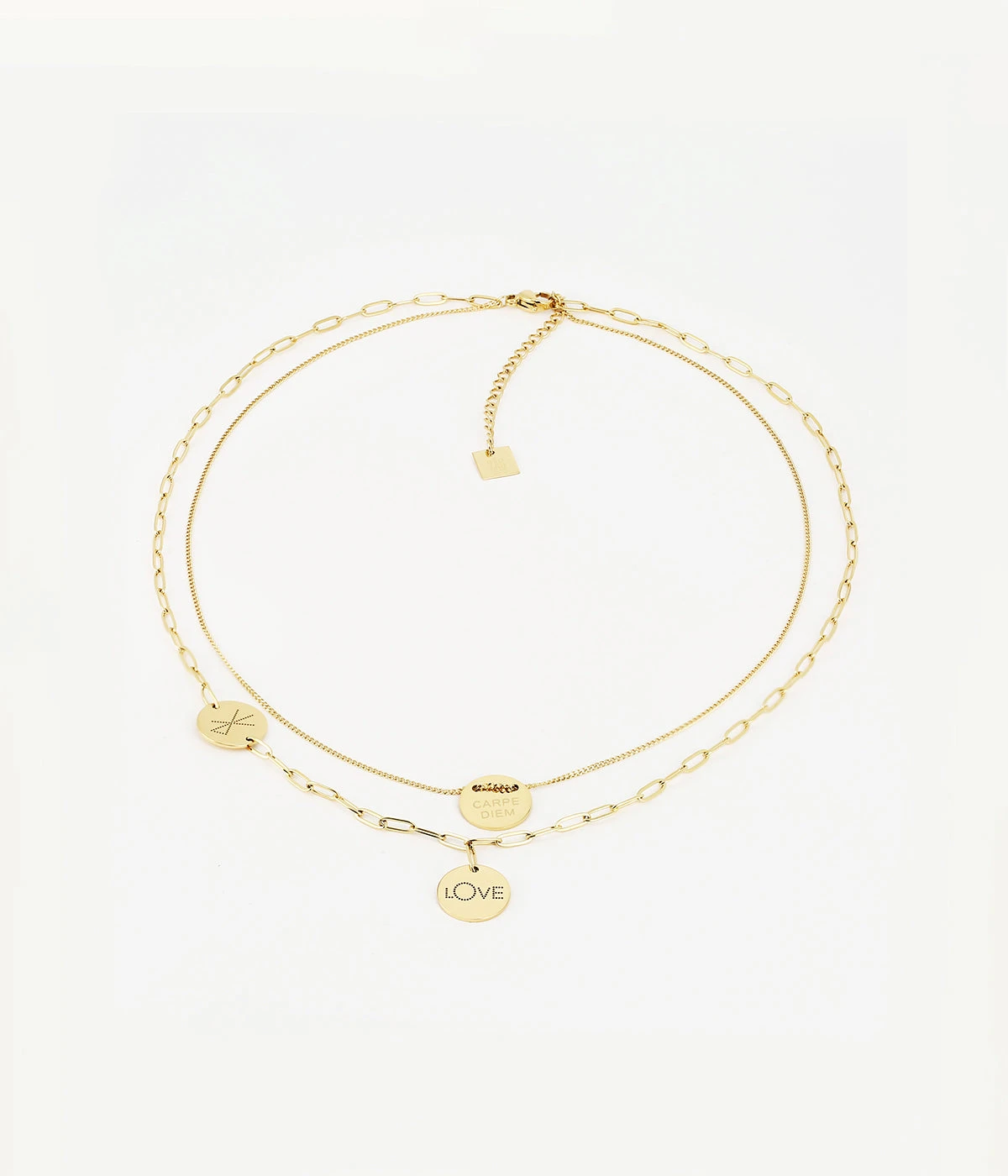 Collier double chaĂźne en acier uni ou dorĂ© Ă lâor fin sur lequel est attachĂ©e une mĂ©daille gravĂ©e du mot « Love».