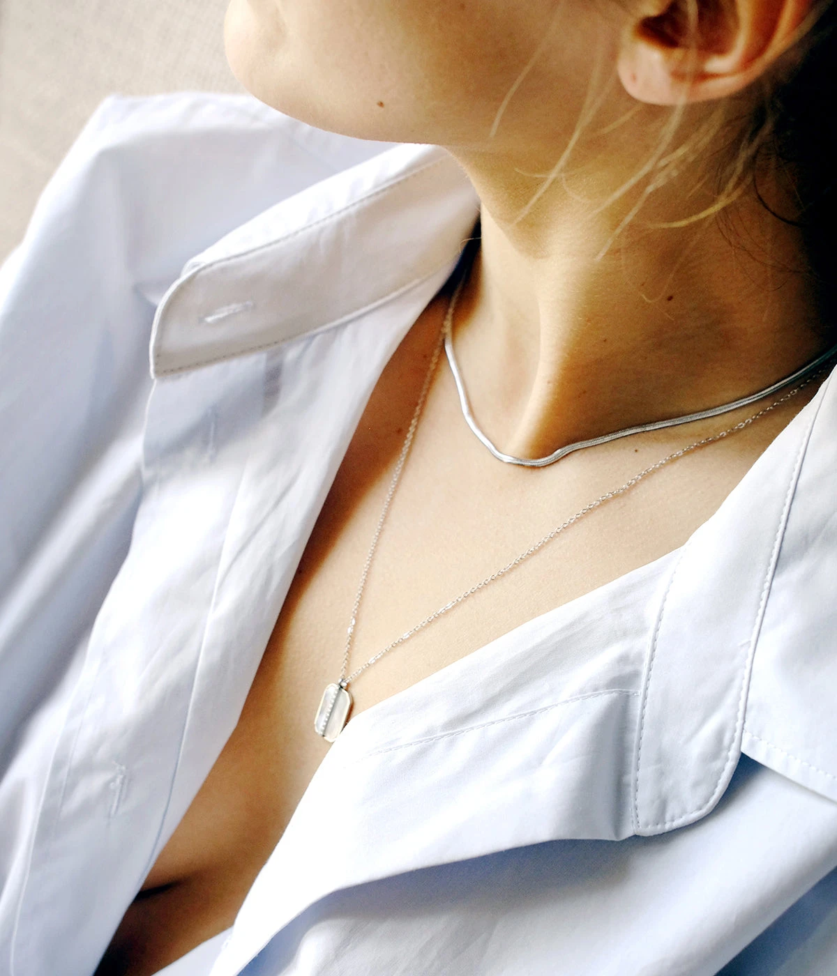Collier double chaĂźne en acier uni ou dorĂ© Ă lâor fin sur lequel est attachĂ© un pendentif rectangulaire de nacre serti de mĂ©tal et divisĂ© en son centre par une baguette de zirconiums.