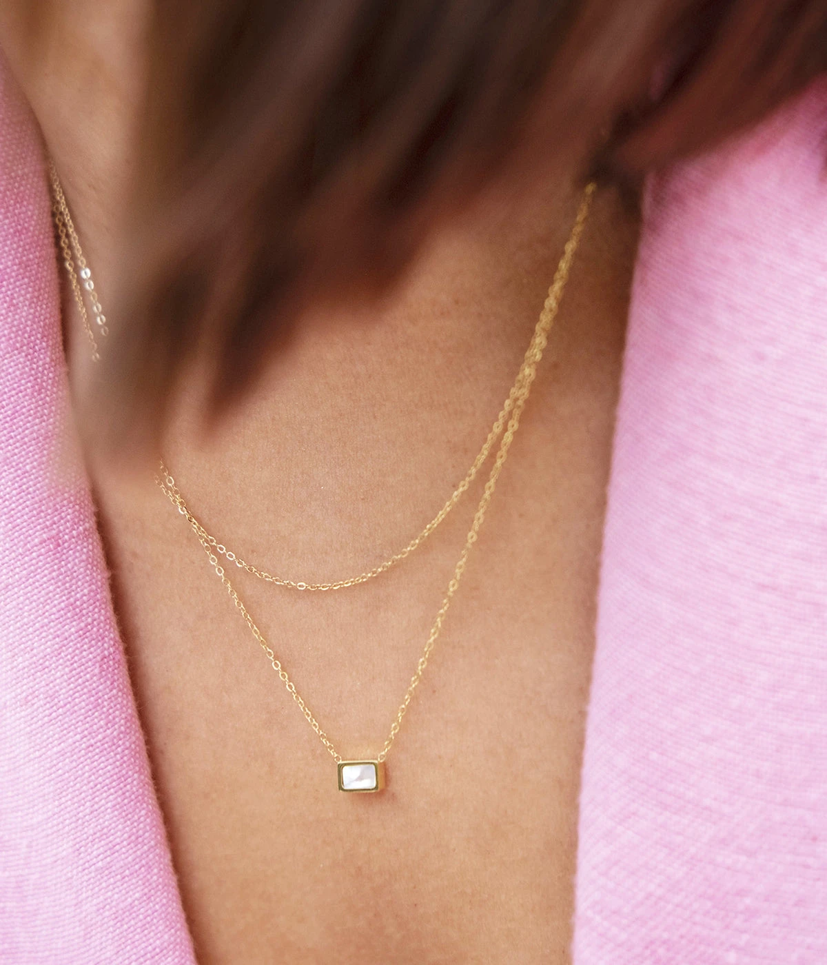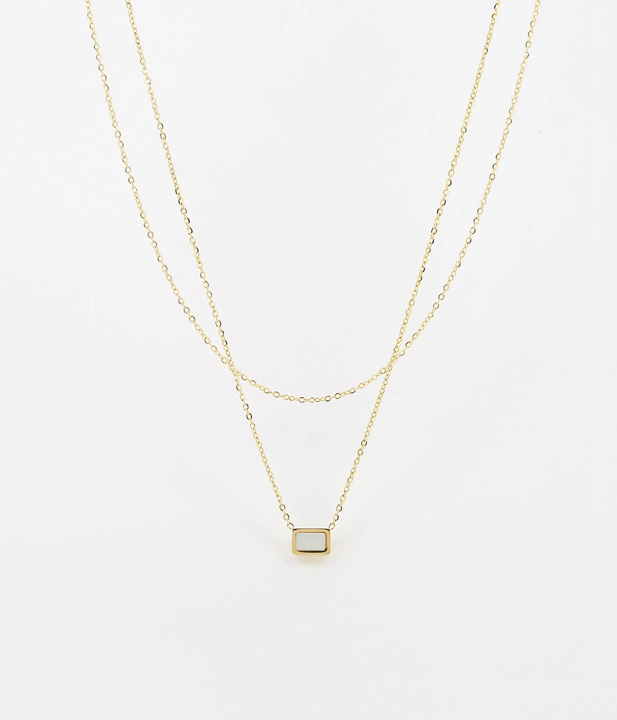 Collier multi-rangs en acier dorĂ© Ă l’or fin sur lequel est attachĂ© un pendentif nacrĂ©.