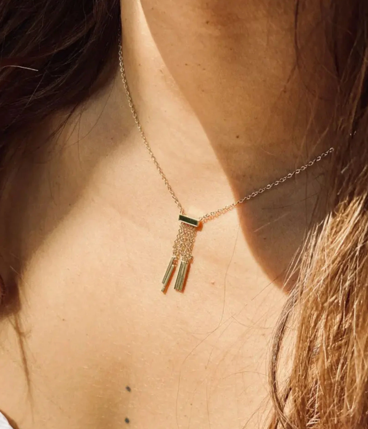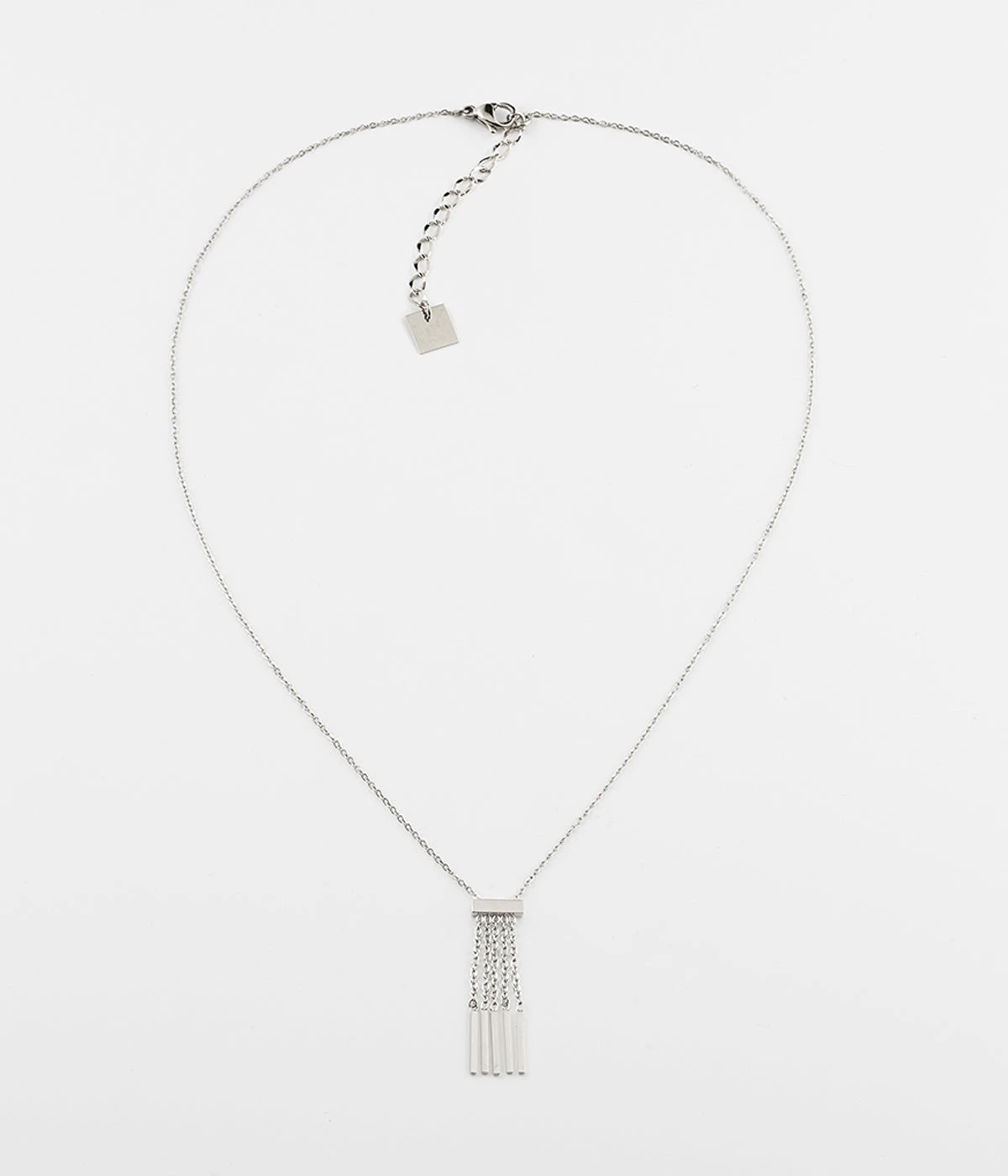 Petite pluie de chaĂźnettes terminĂ©es de pampilles de mĂ©tal pour ce collier en acier uni ou dorĂ© Ă l’or fin.