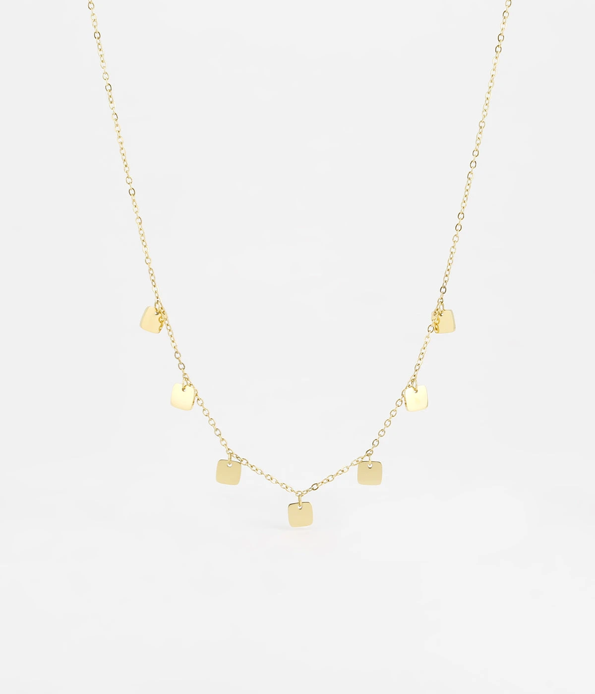 Collier en acier uni ou dorĂ© Ă l’or fin sur lequel sont attachĂ©es des pampilles de forme gĂ©omĂ©trique.