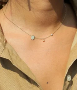 Collier en acier uni ou dorĂ© Ă l’or fin sur lequel est suspendu un pendentif serti de zirconiums.