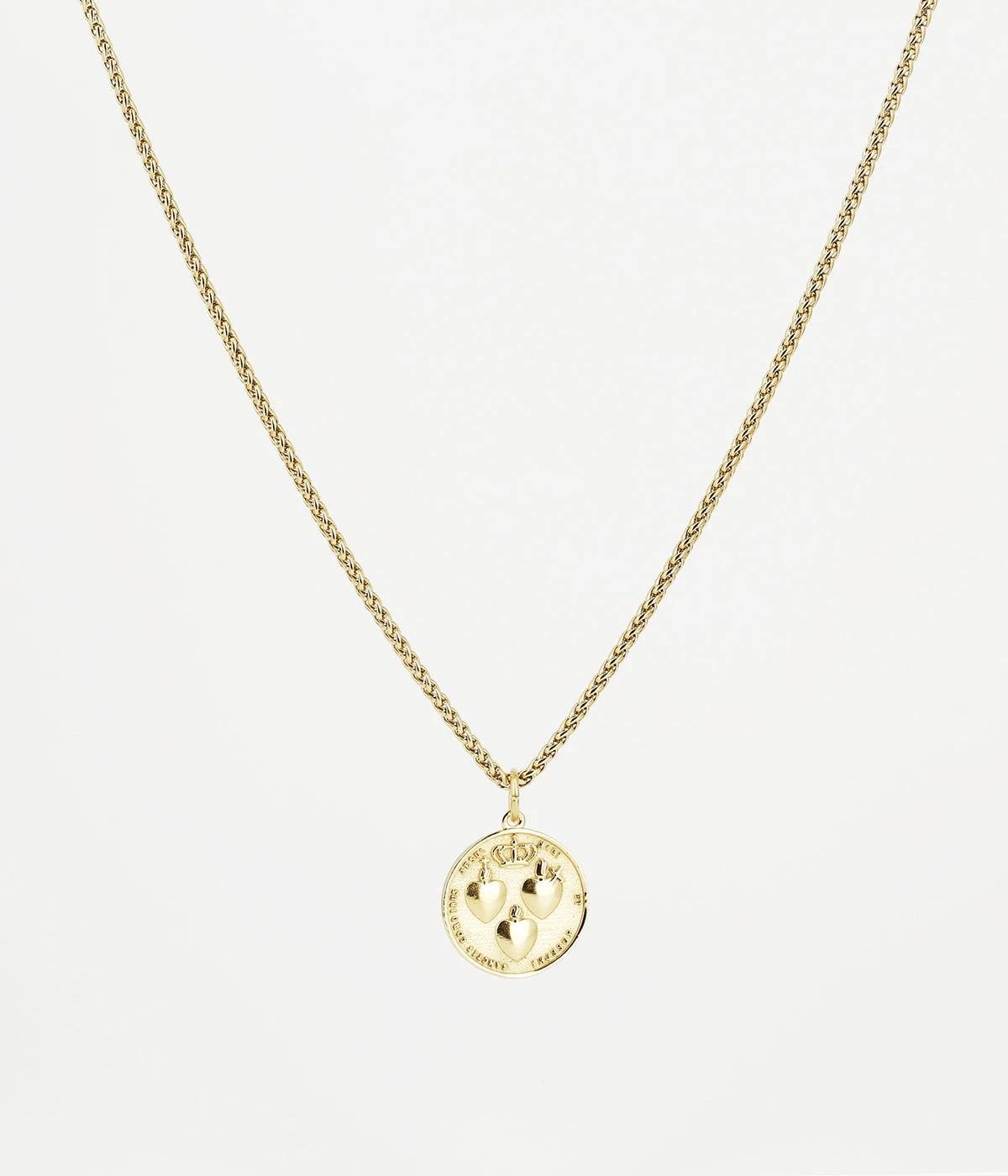 Collier medium en acier dorĂ© Ă l’or fin sur lequel est suspendu un mĂ©daillon gravĂ© de mots latins et de motifs.