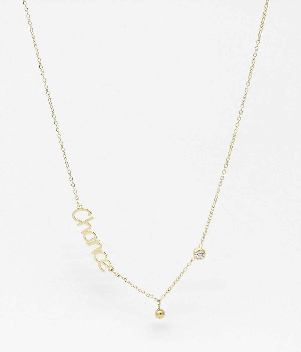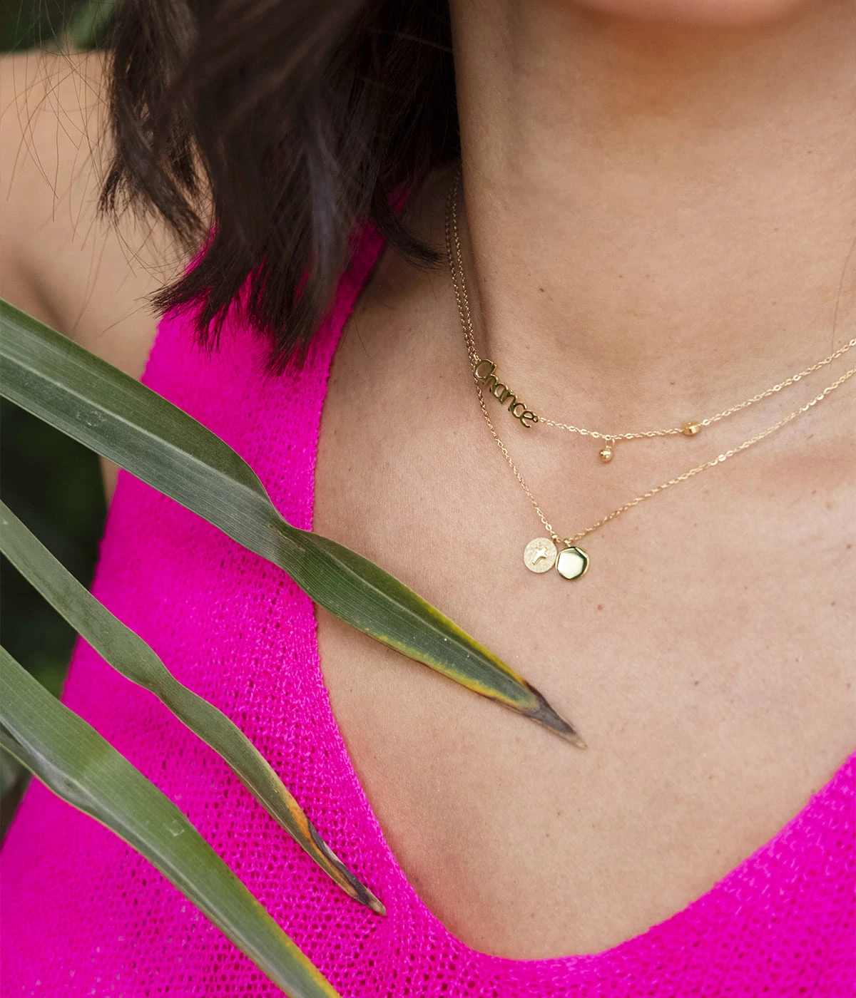 Collier chaĂźnette en acier uni ou dorĂ© Ă lâor fin sur lequel sont attachĂ©s le mot « Chance » et un zirconium serti. Ce collier se place dĂ©licatement sur votre cou vous portera bonheur.