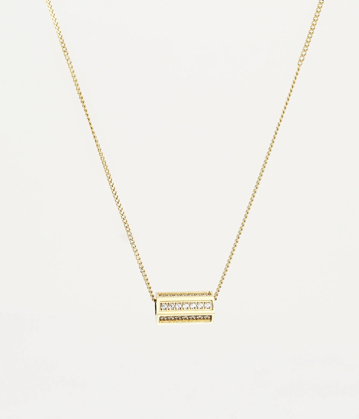Collier en acier uni ou dorĂ© Ă l’or fin sur lequel est attachĂ© un cylindre serti de zirconiums.