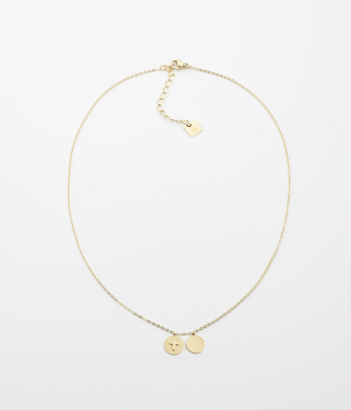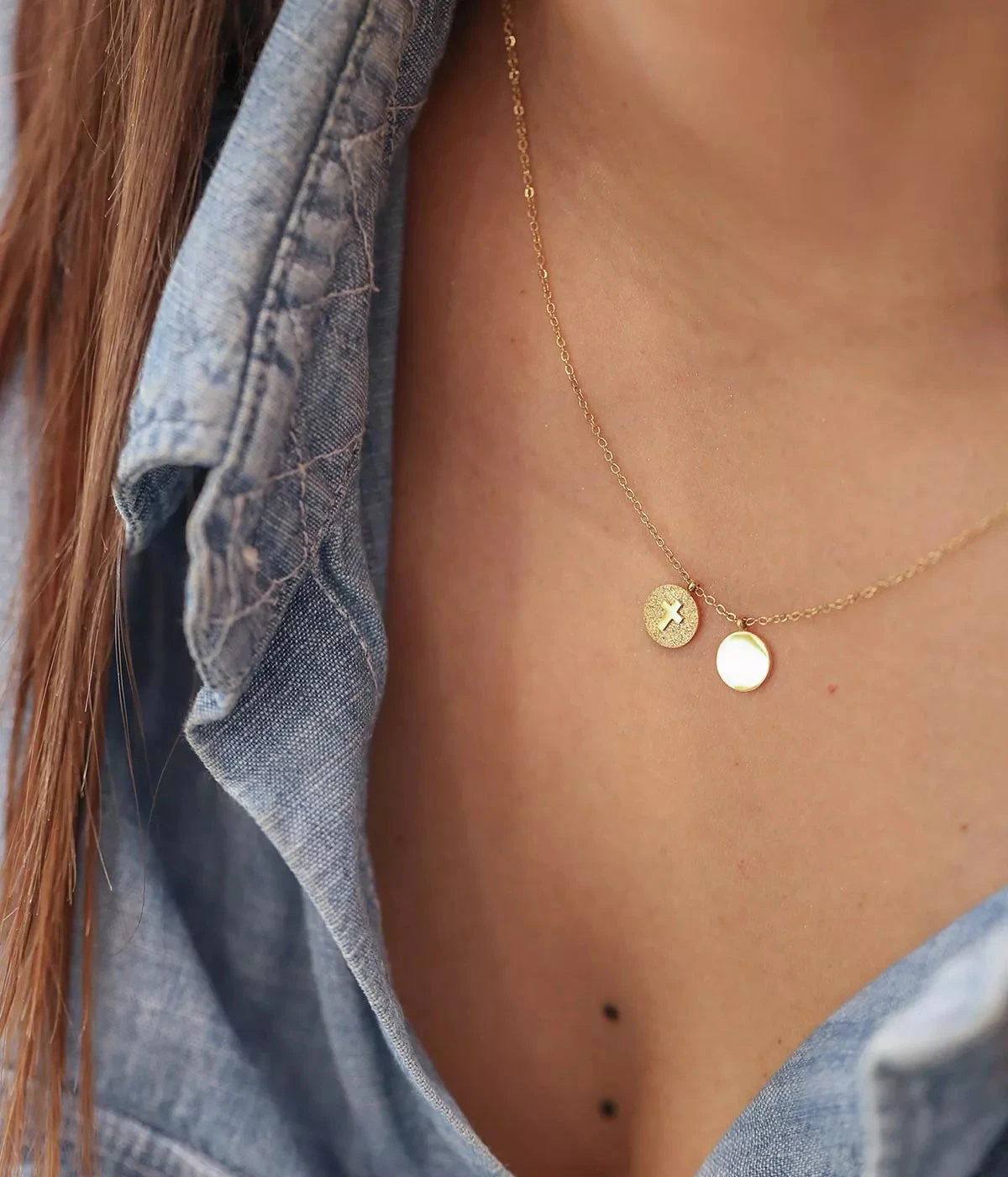 Collier chaĂźne en acier dorĂ© Ă l’or fin sur lequel sont attachĂ©es deux petites mĂ©dailles, l’une avec un motif croix sur fond martelĂ©, et l’autre, lisse et pure.