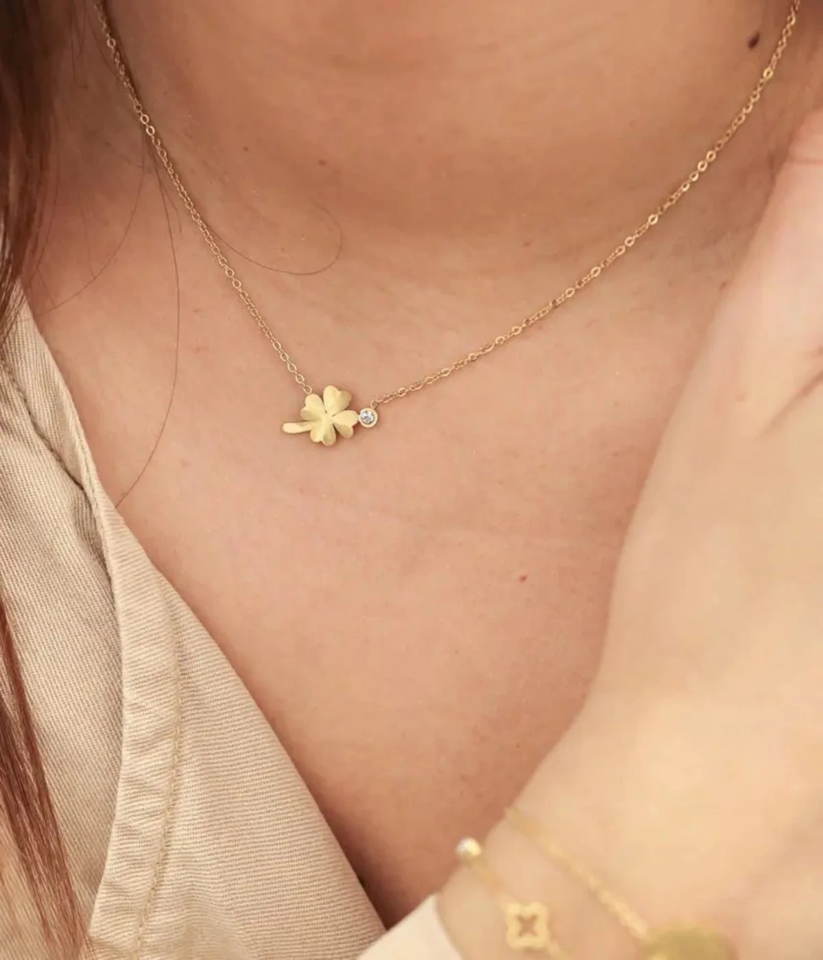 Collier en acier uni ou doré à l’or fin orné d’un motif de trèfle accompagné d’un cristal blanc en serti clos.