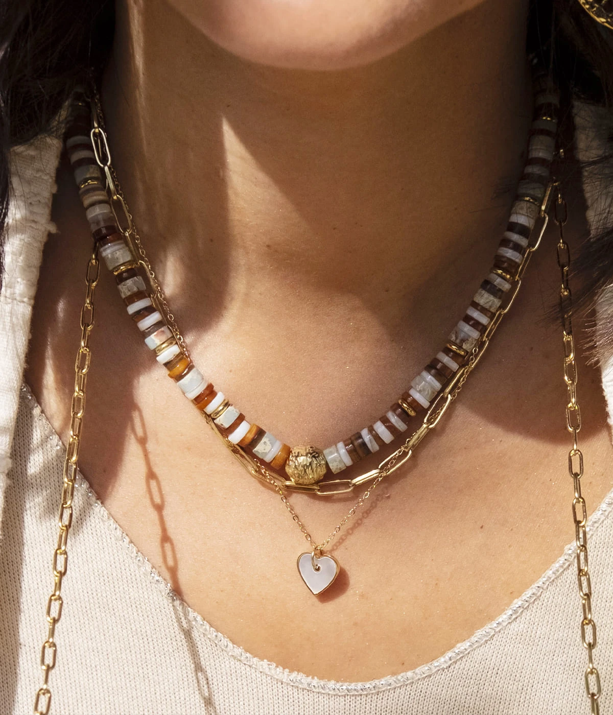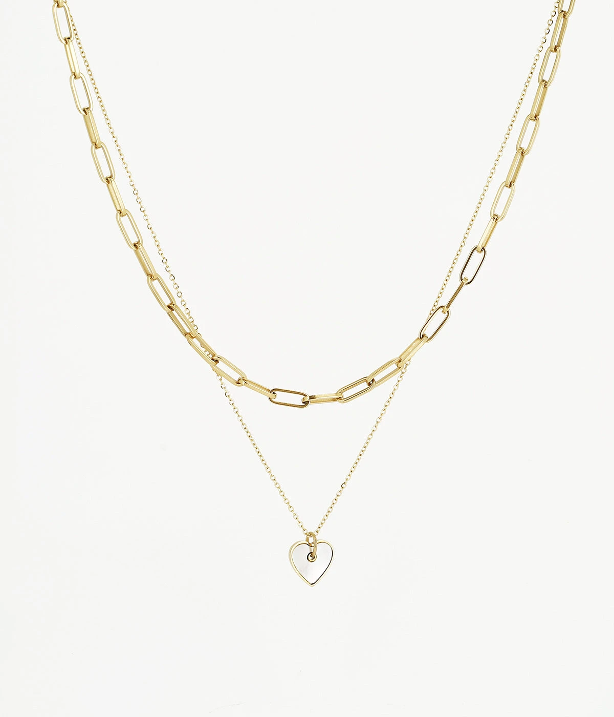 Collier double chaĂźne en acier dorĂ© Ă lâor fin sur lequel est accrochĂ© un petit cĆur en nacre.