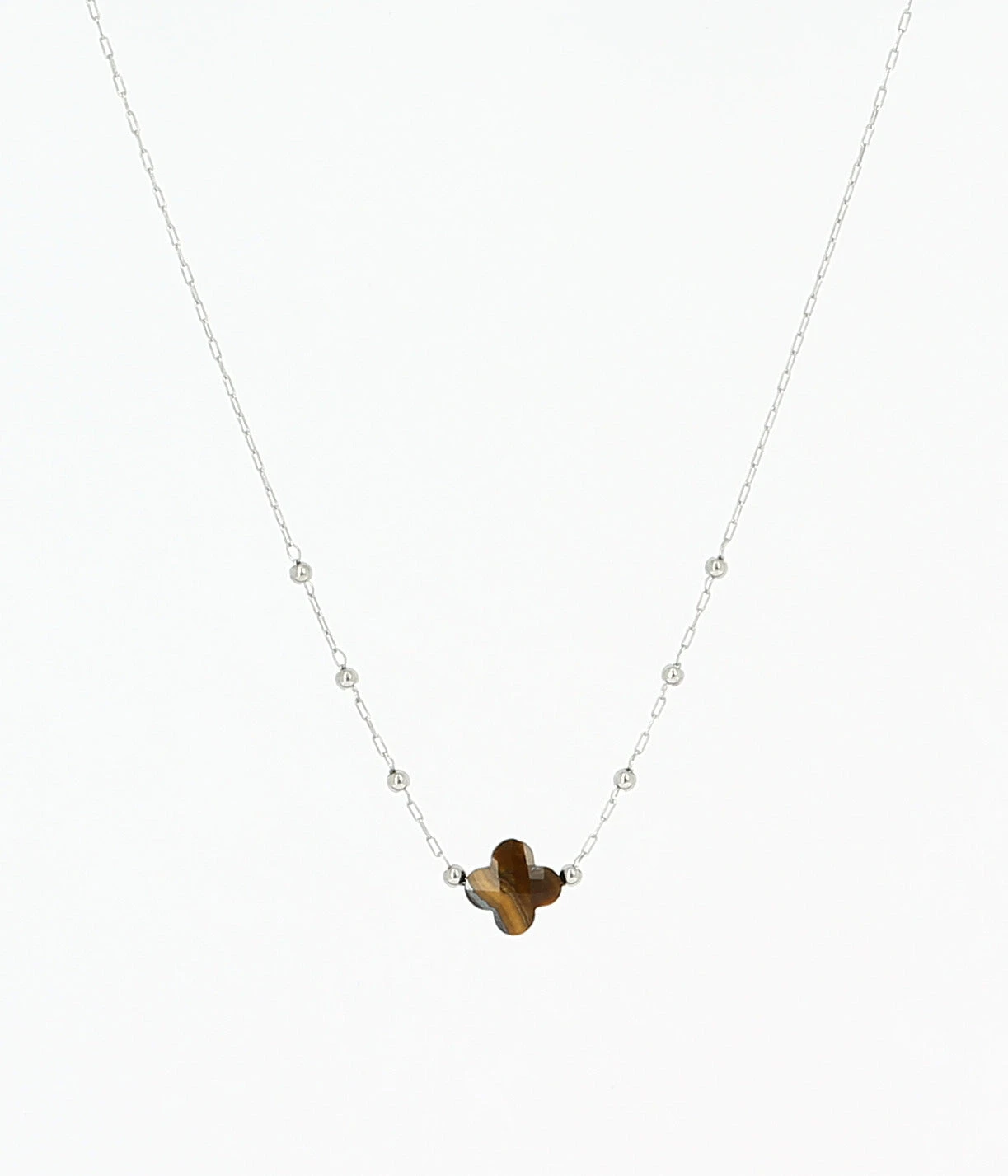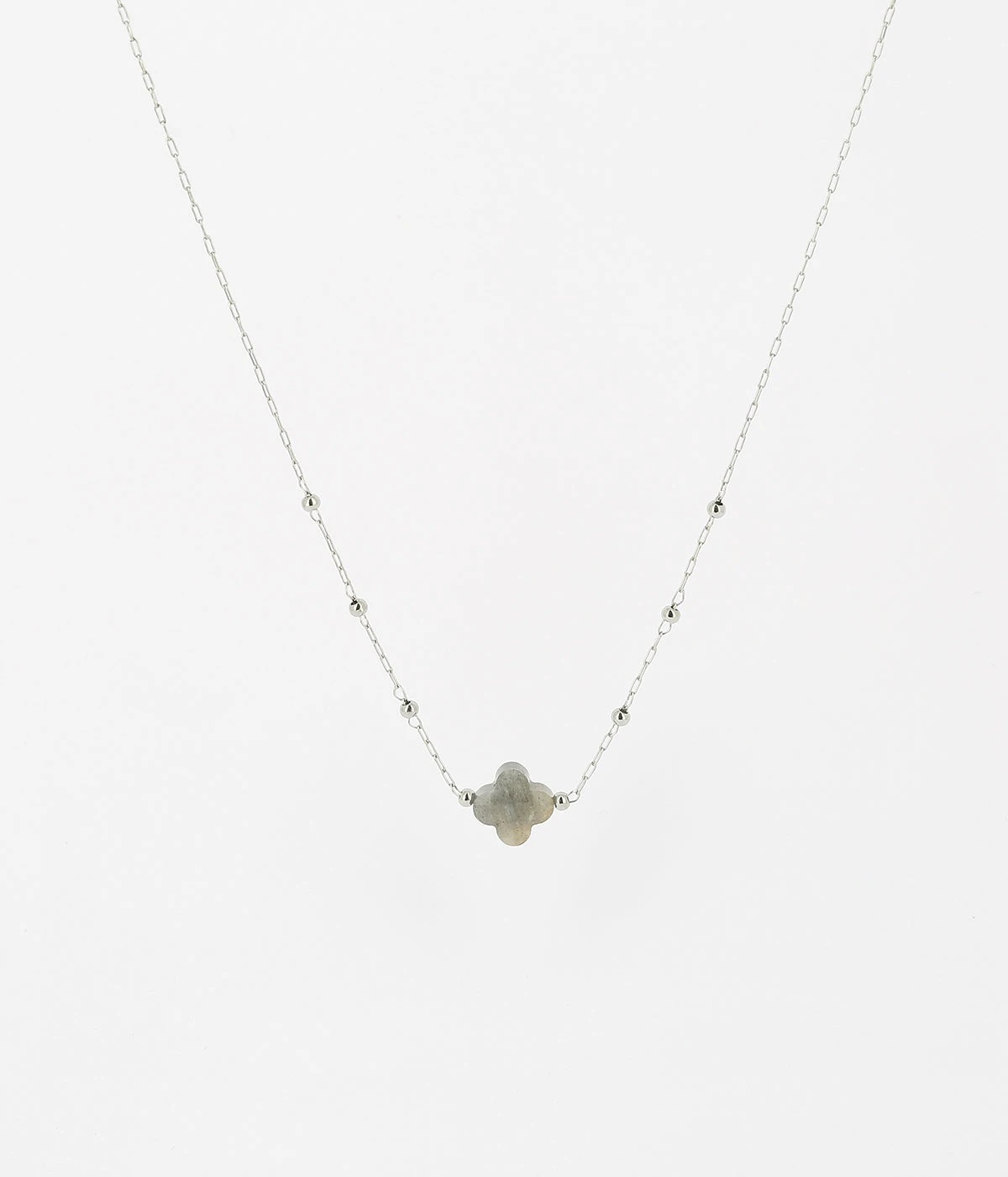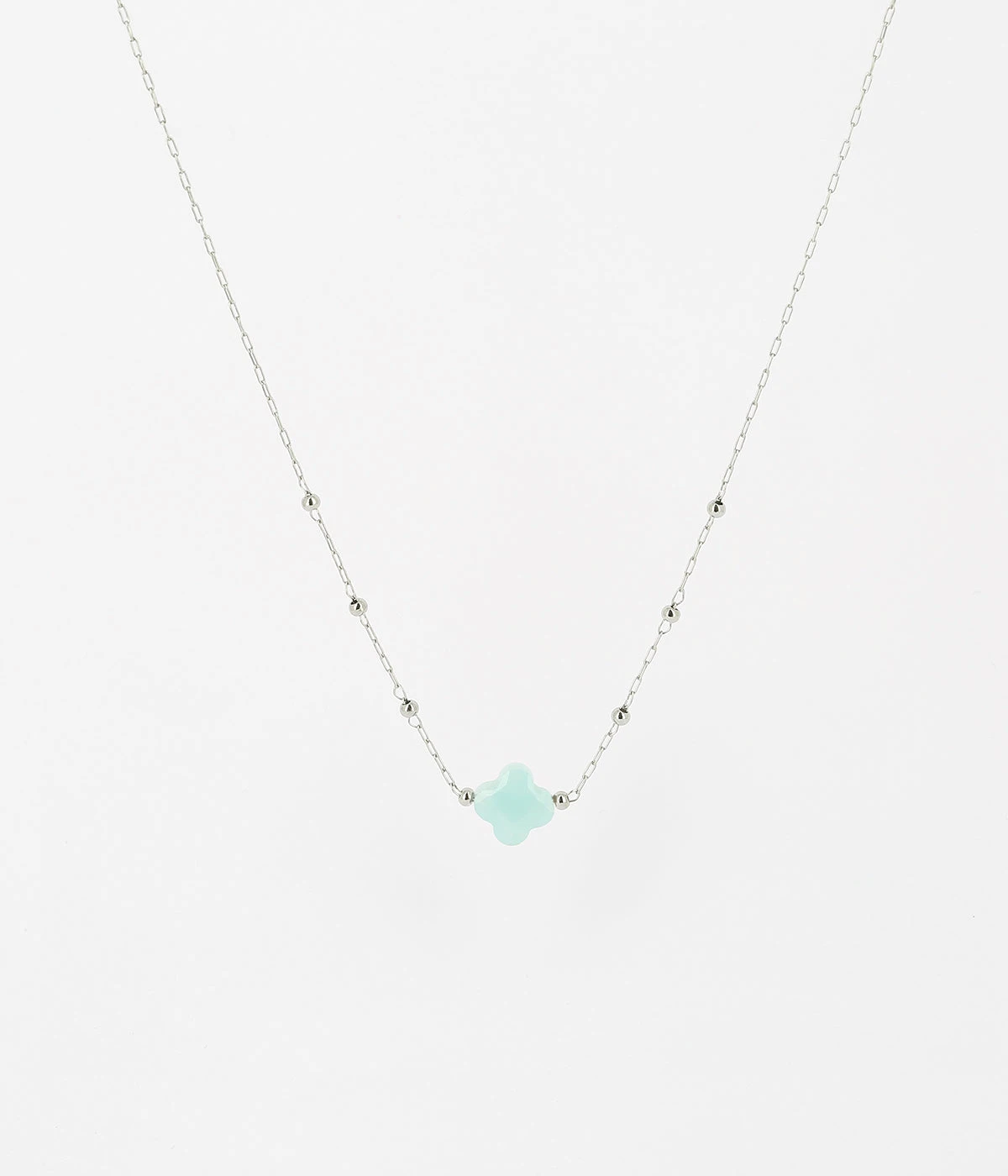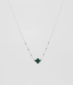 Collier chaĂźne « chapelet » en acier uni ou dorĂ© Ă l’or fin sur lequel est attachĂ©e une pierre naturelle en forme de petit trĂšfle.