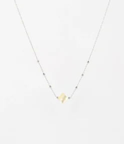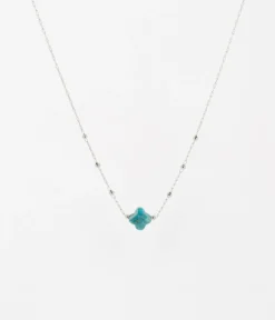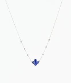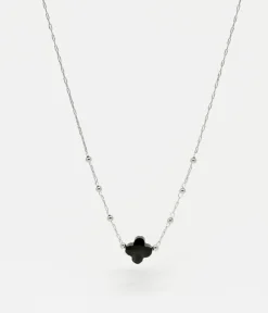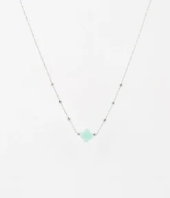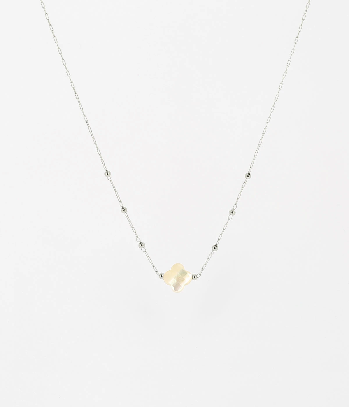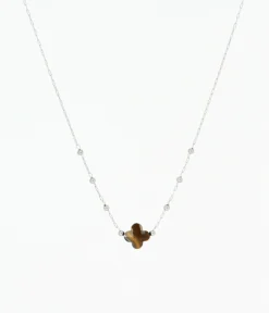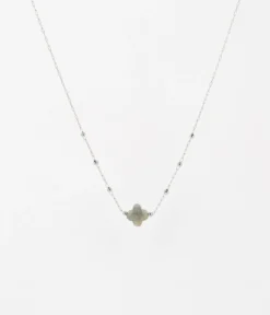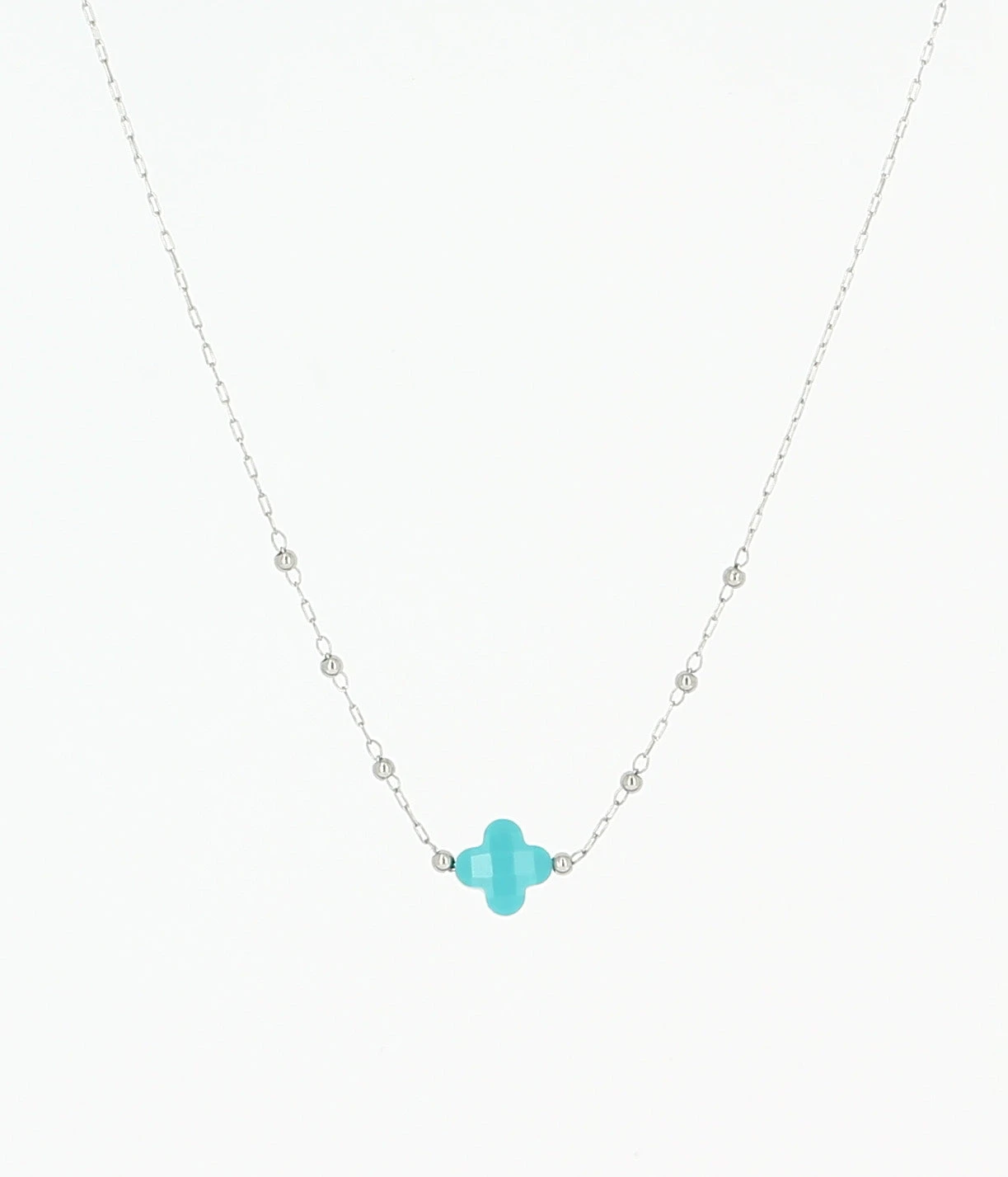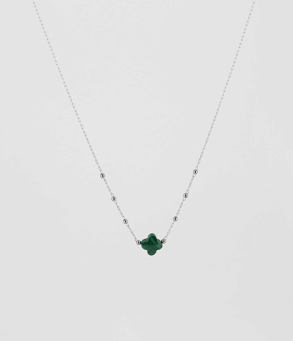 Collier chaĂźne « chapelet » en acier uni ou dorĂ© Ă l’or fin sur lequel est attachĂ©e une pierre naturelle en forme de petit trĂšfle.