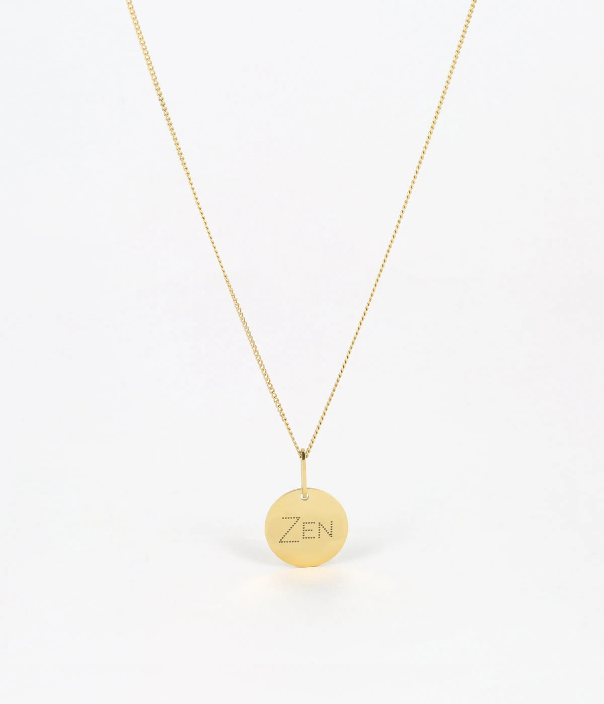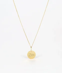 Collier chaĂźne en acier uni ou dorĂ© Ă lâor fin sur lequel une mĂ©daille gravĂ©e du mot « Zen » est attachĂ©e. La gravure est rĂ©alisĂ©e Ă la main dans nos ateliers et sa rĂ©alisation au petit point est pleine de dĂ©licatesse.