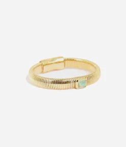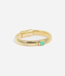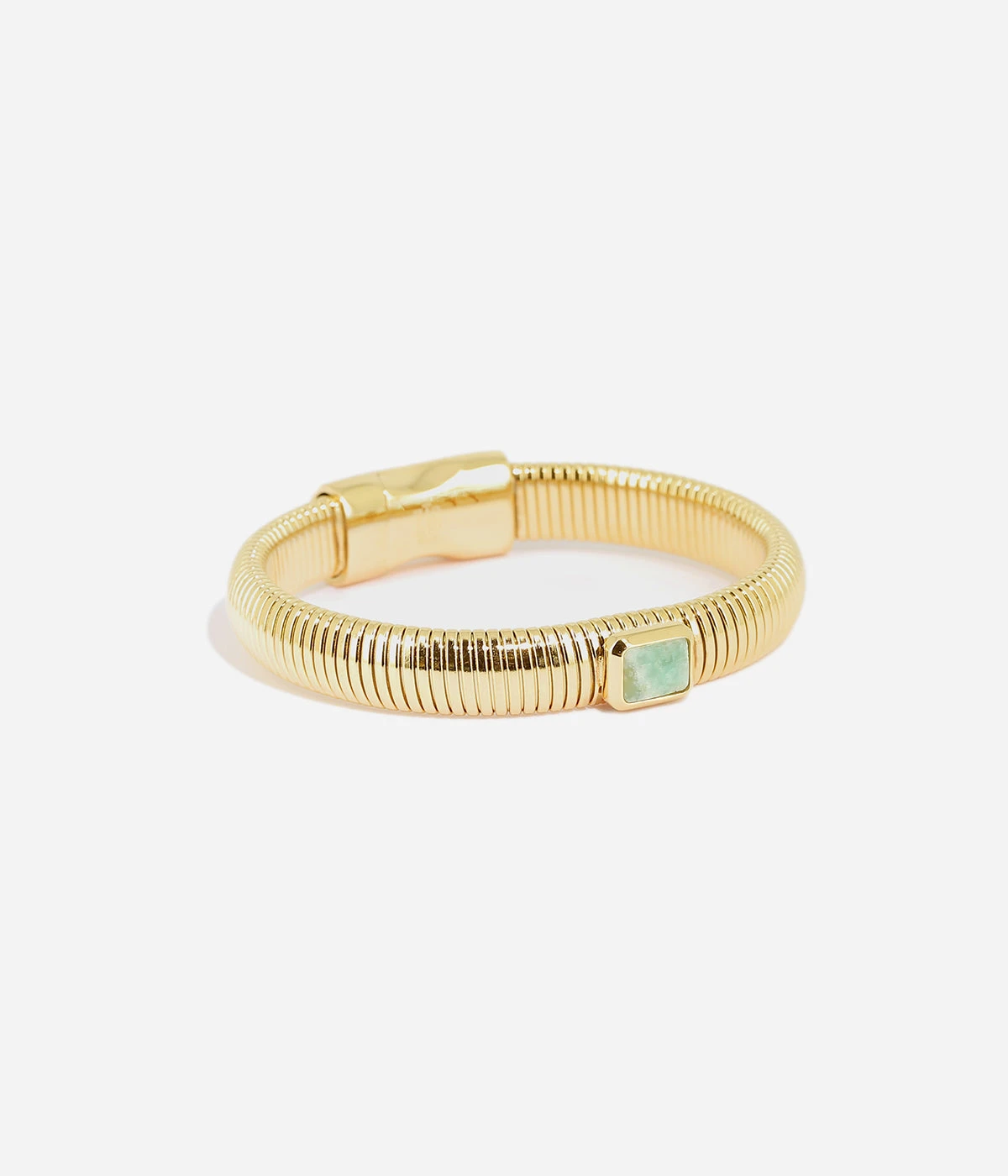 Bracelet jonc aimantĂ© en acier dorĂ© Ă l’or fin imitant un accordĂ©on avec un carrĂ© de pierre naturelle en son centre.