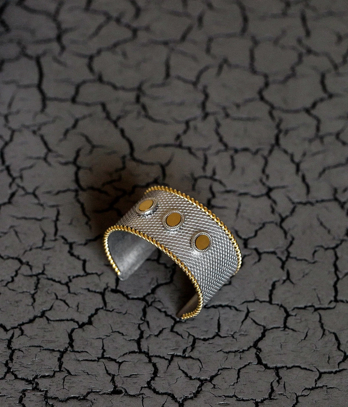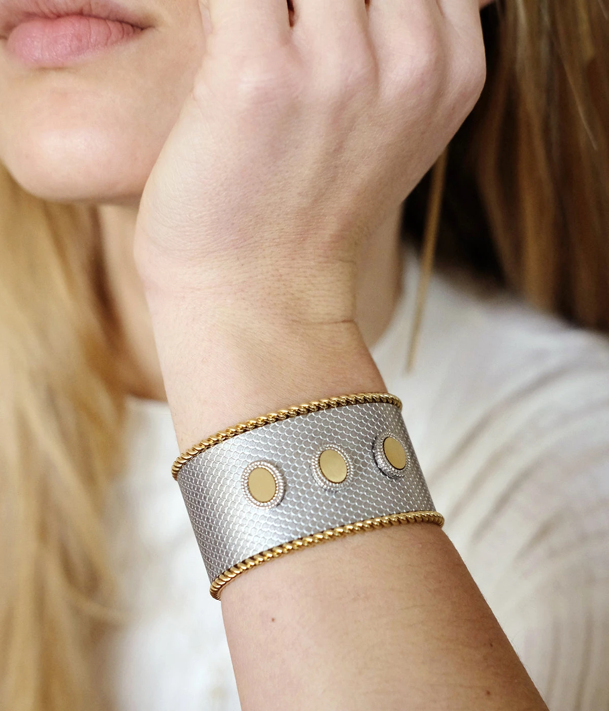 Bracelet manchette en acier uni ou dorĂ© Ă lâor fin sur lequel de l’acier dorĂ© est placĂ© en serti-clos.Â