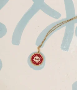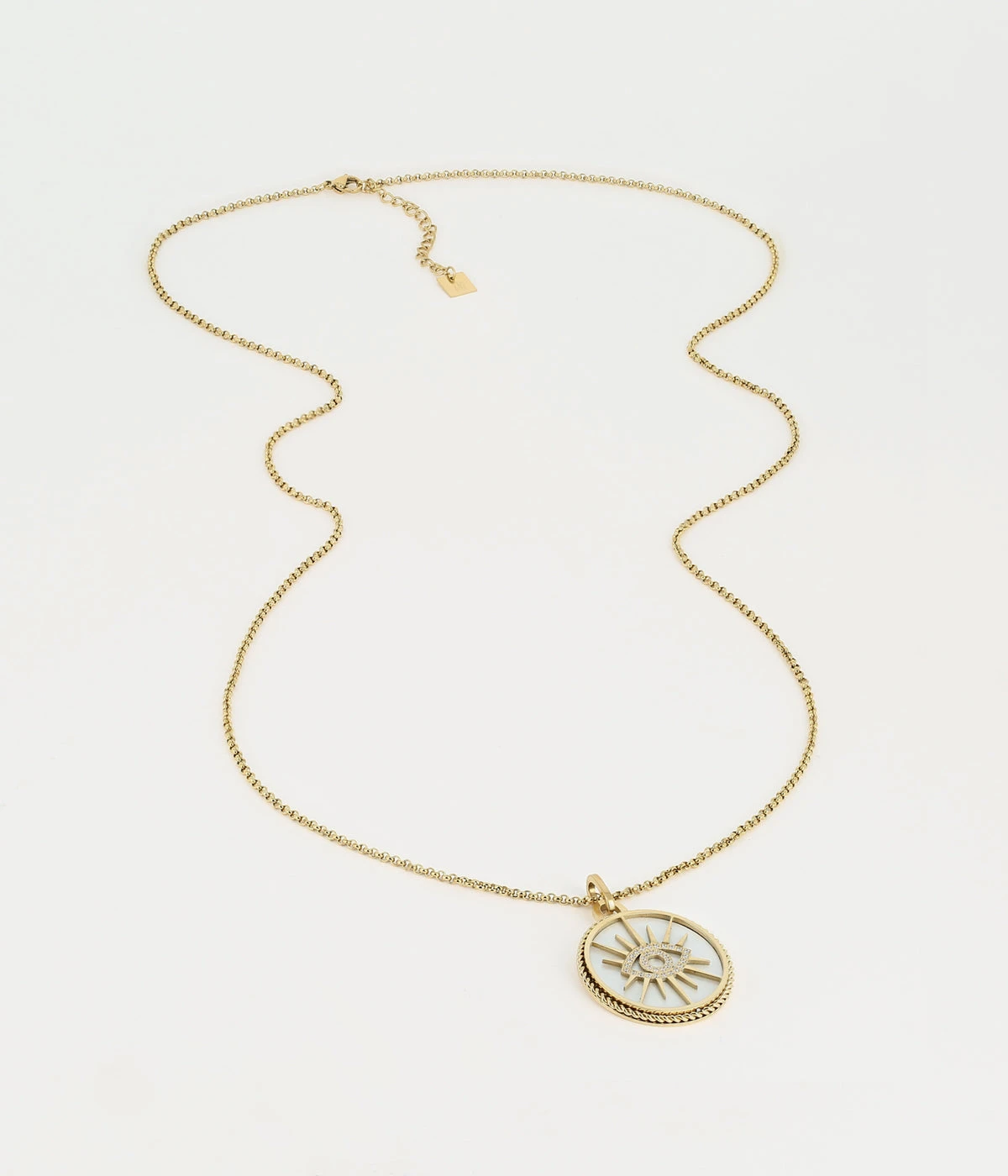Collier long en acier dorĂ© Ă lâor fin sur lequel est attachĂ©e une mĂ©daille colorĂ©e prĂ©sentant un Ćil protecteur.
