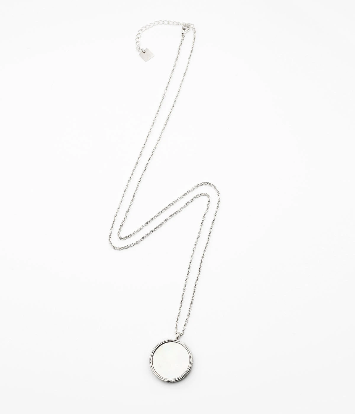 Collier long « à l’ancienne » en acier uni ou dorĂ© Ă l’or fin sur laquelle est accrochĂ©e une mĂ©daille de nacre.