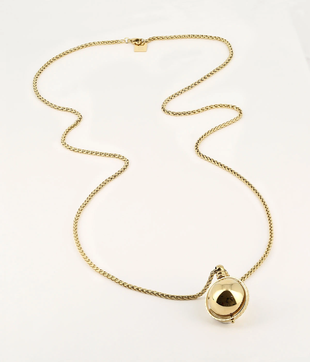 Collier long en acier uni ou dorĂ© Ă l’or fin sur lequel est attachĂ© un pendentif possĂ©dant une boule en acier.