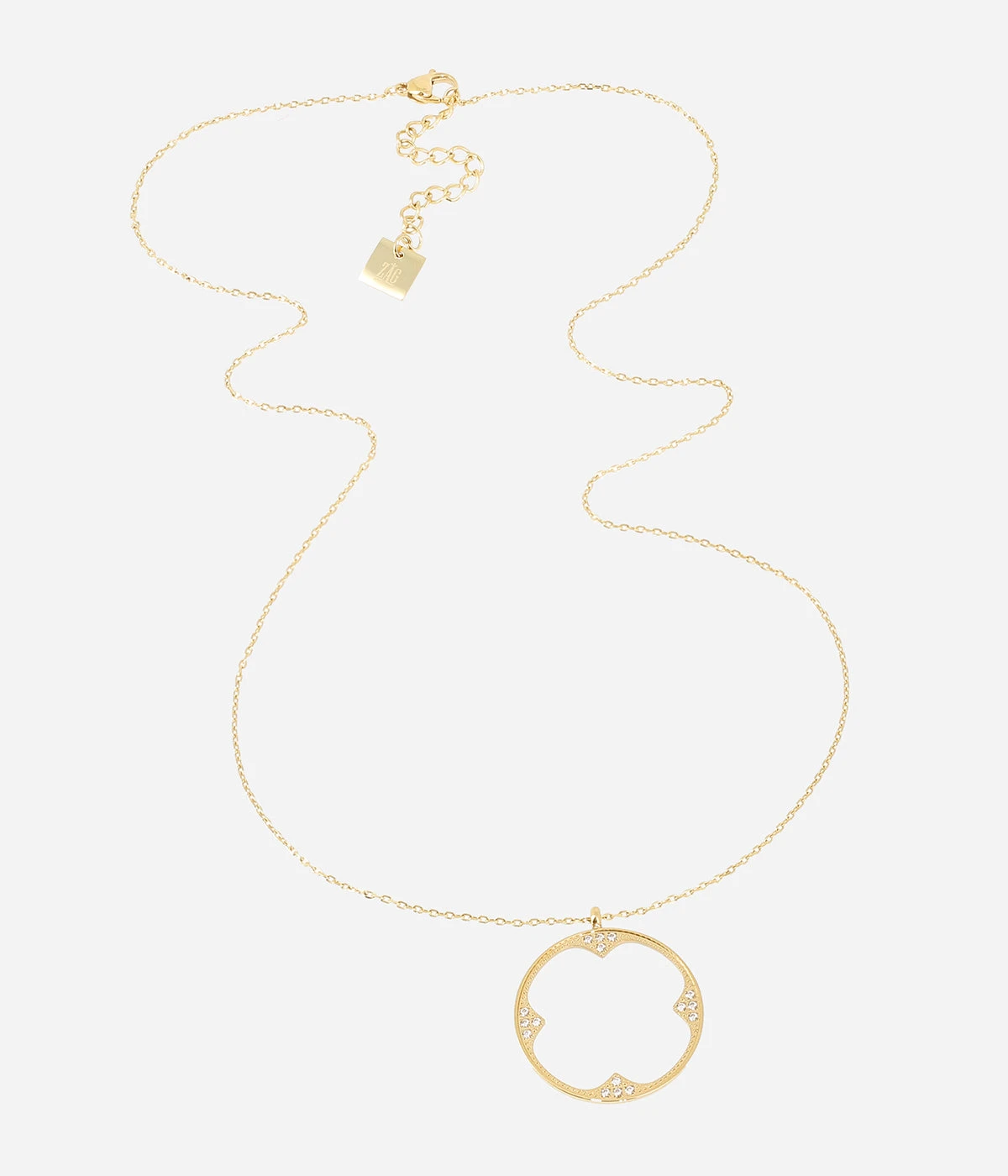 Collier long en acier doré sur lequel est suspendu un médaillon en forme de cercle serti de zirconiums.