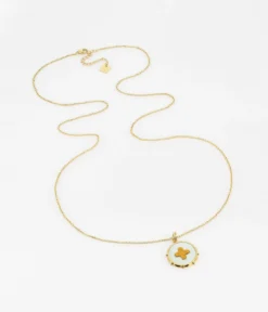 Collier long en acier dorĂ© Ă l’or fin sur lequel est attachĂ© un pendentif en nacre serti d’une pierre naturelle.