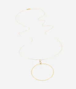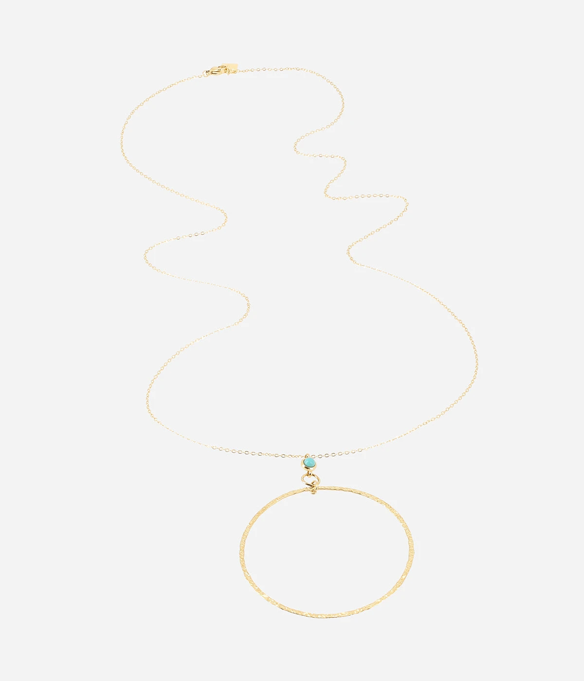 Sautoir en acier dorĂ© Ă l’or fin avec une petite pierre naturelle Ă la base qui relie un cercle martelĂ©.