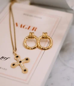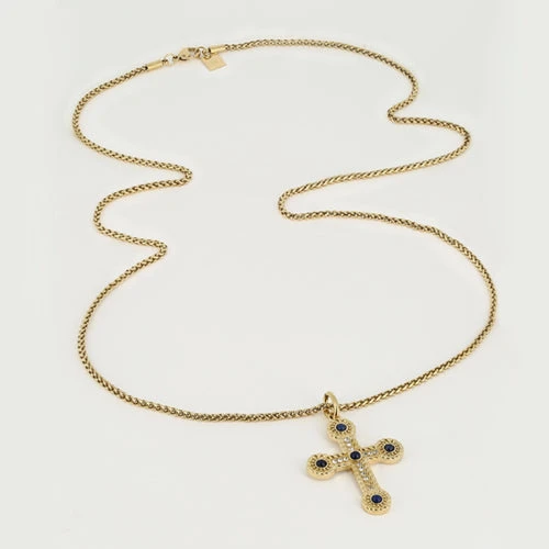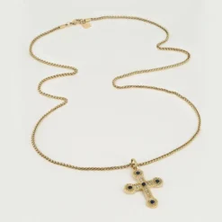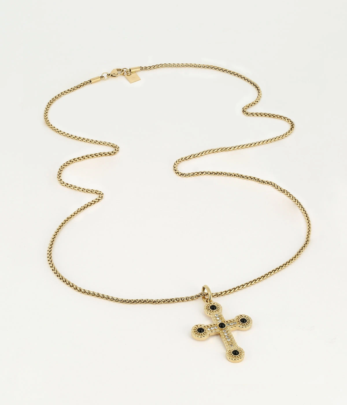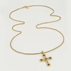 Collier long en acier uni ou dorĂ© Ă l’or fin sur lequel est suspendue une croix sertie de zirconiums et pierres naturelles.
