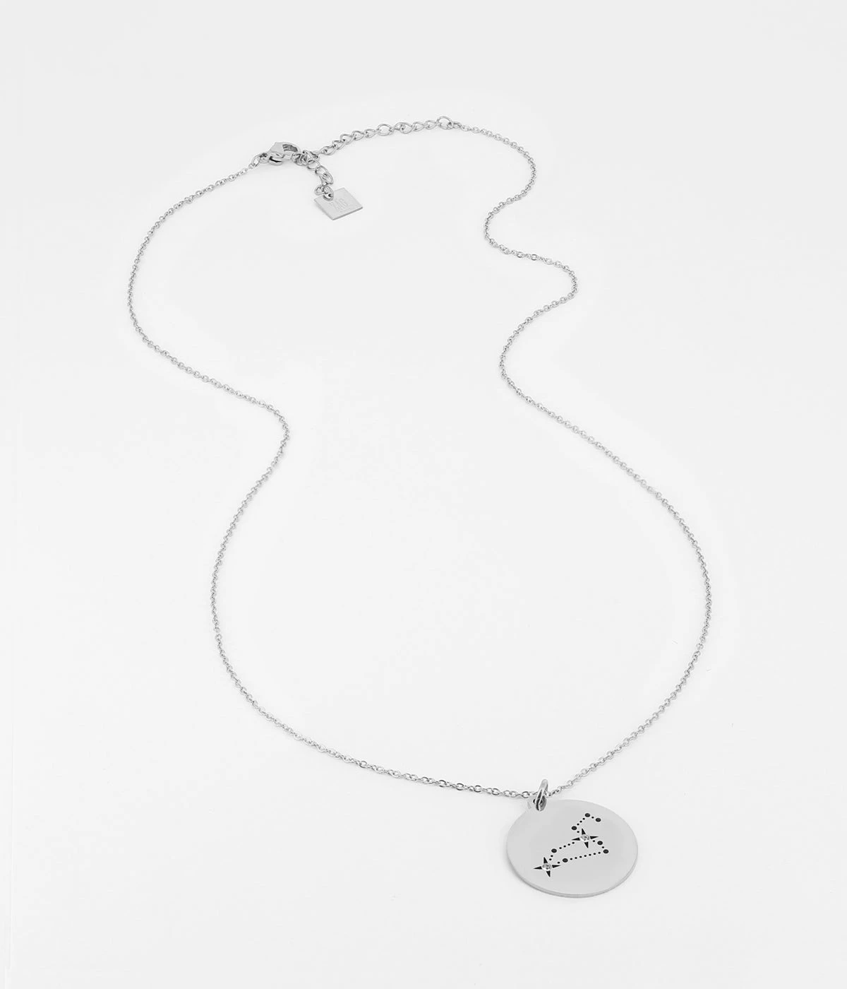 Collier en acier uni ou dorĂ© Ă l’or fin sur lequel est suspendu un pendentif gravĂ© de la constellation reprĂ©sentant le signe astrologique Lion.