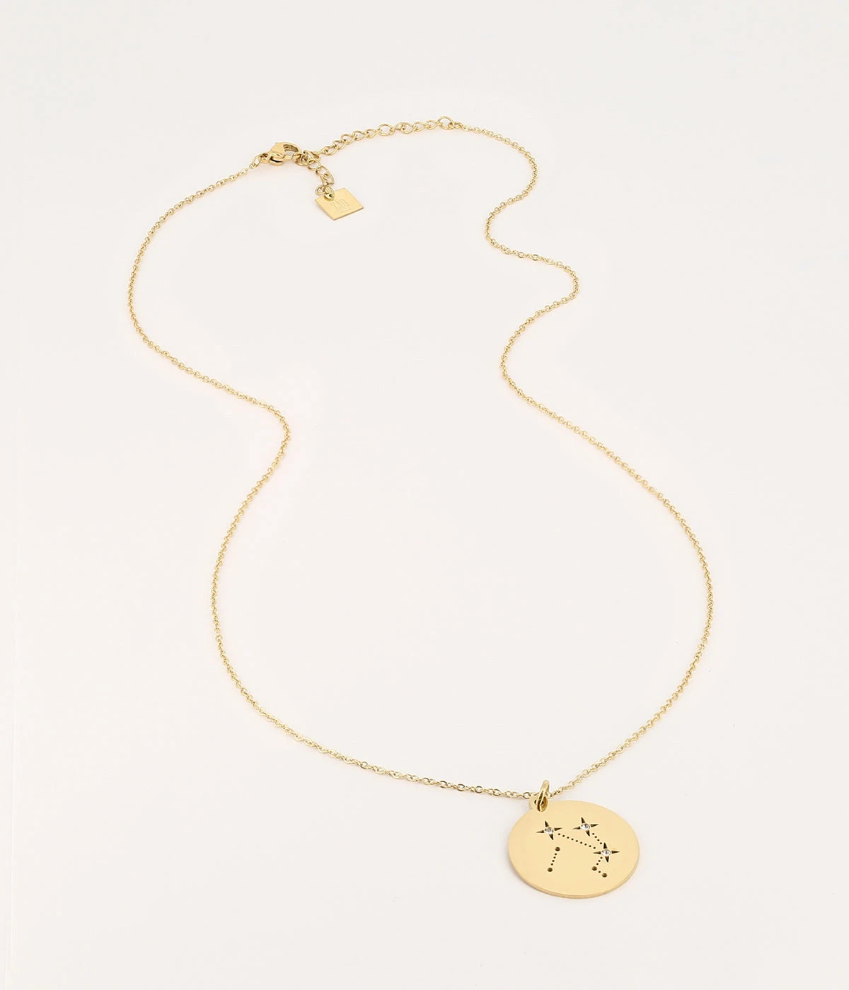 Collier en acier uni ou dorĂ© Ă l’or fin sur lequel est suspendu un pendentif gravĂ© de la constellation reprĂ©sentant le signe astrologique Balance.