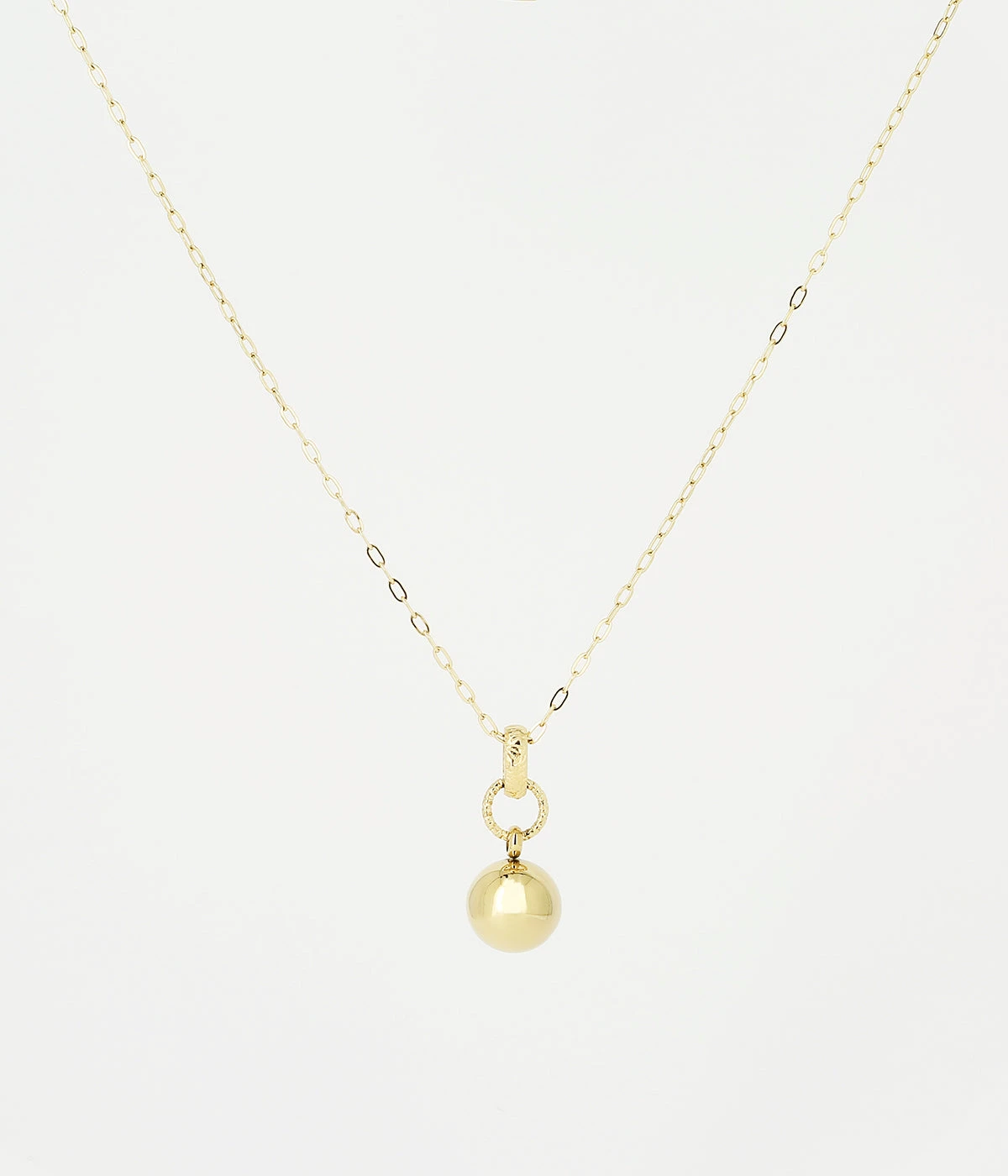 Collier long en acier uni ou dorĂ© Ă lâor fin sur lequel est attachĂ© un pendentif boule.