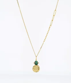 Collier long en acier dorĂ© Ă lâor fin sur lequel est attachĂ© un cabochon de pierre naturelle et une mĂ©daille martelĂ©e. La chaĂźne dans sa longueur est parsemĂ©e de diffĂ©rents maillons donnant une allure contemporaine Ă ce sautoir.