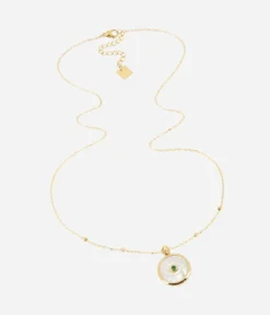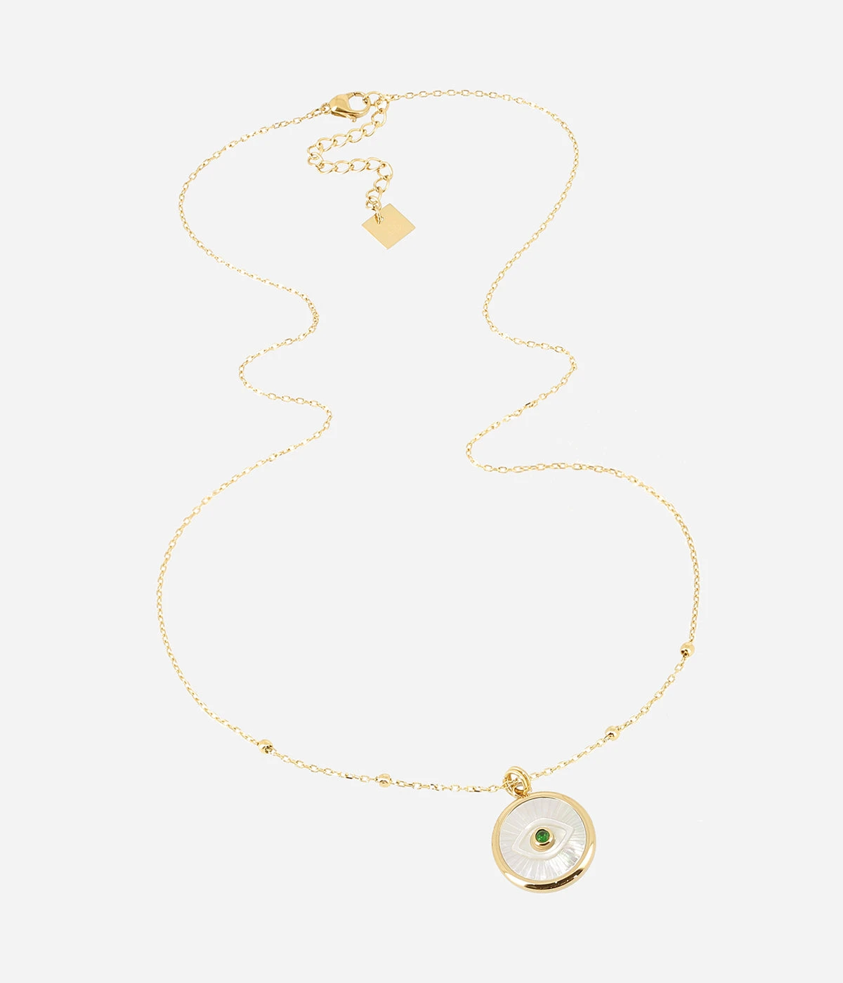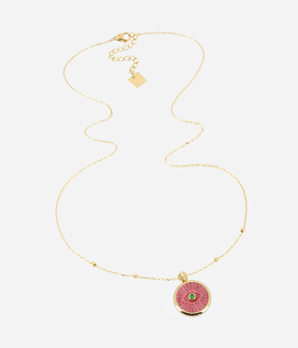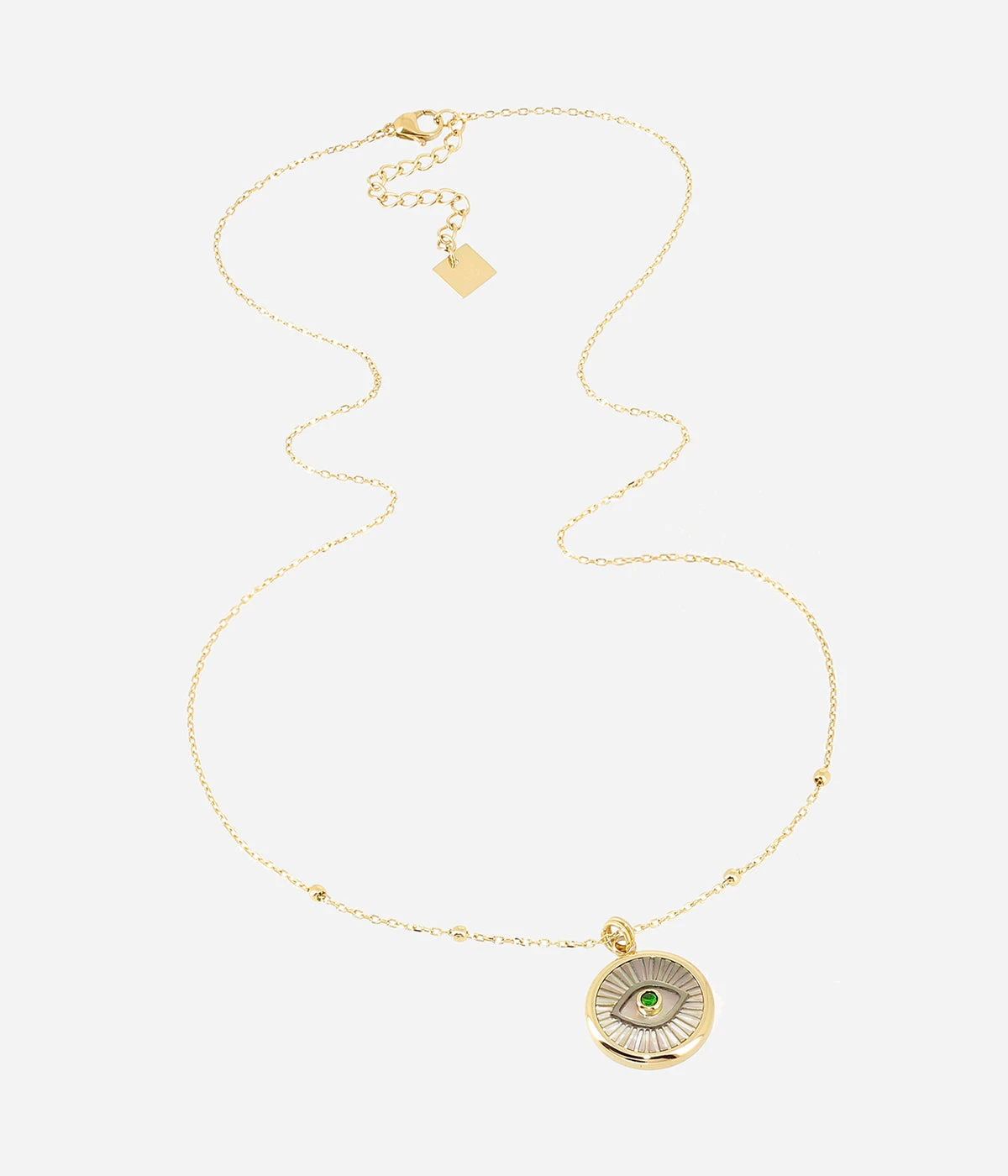Sautoir en acier dorĂ© Ă l’or fin avec un mĂ©daillon qui arbore une pierre naturelle taillĂ©e en forme d’Ćil.