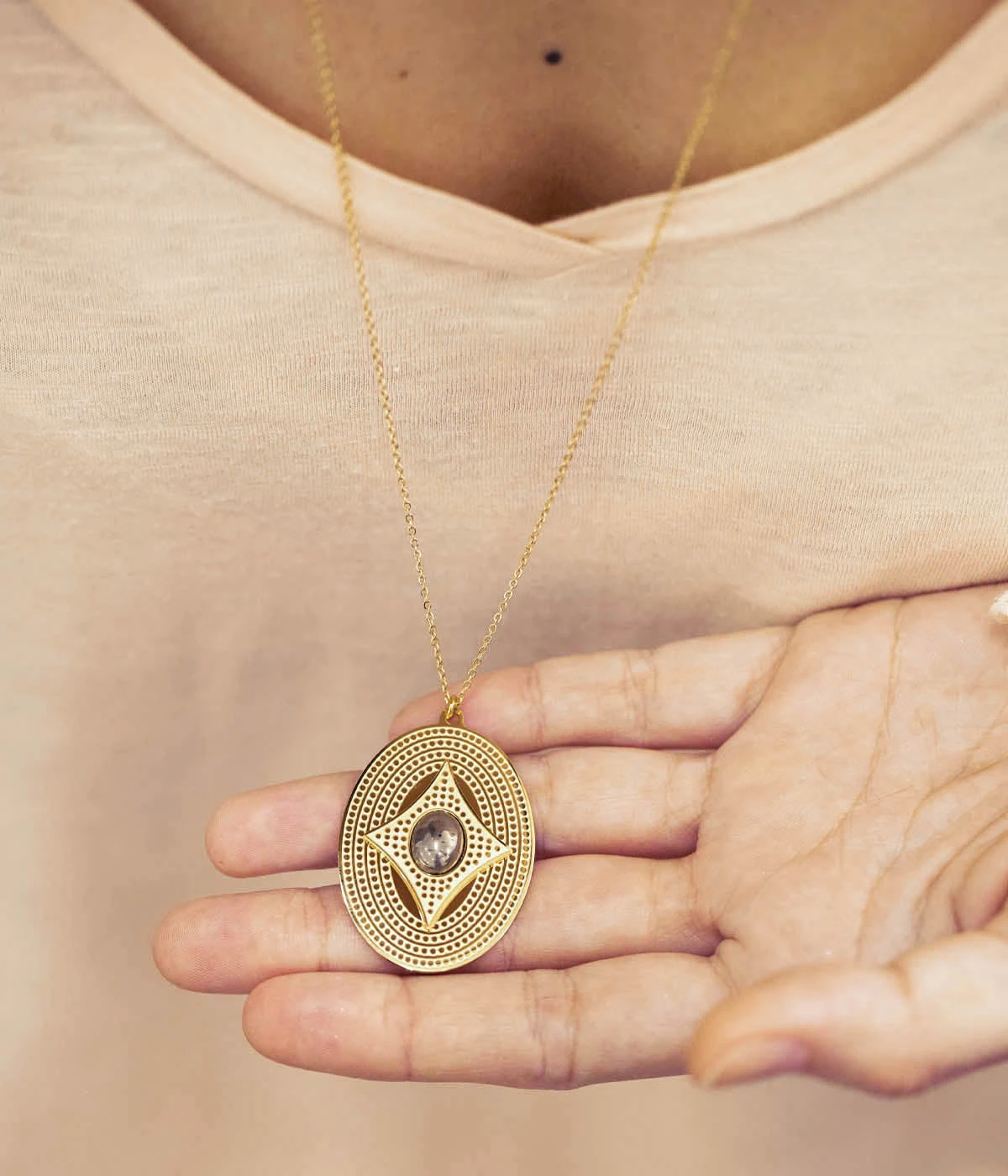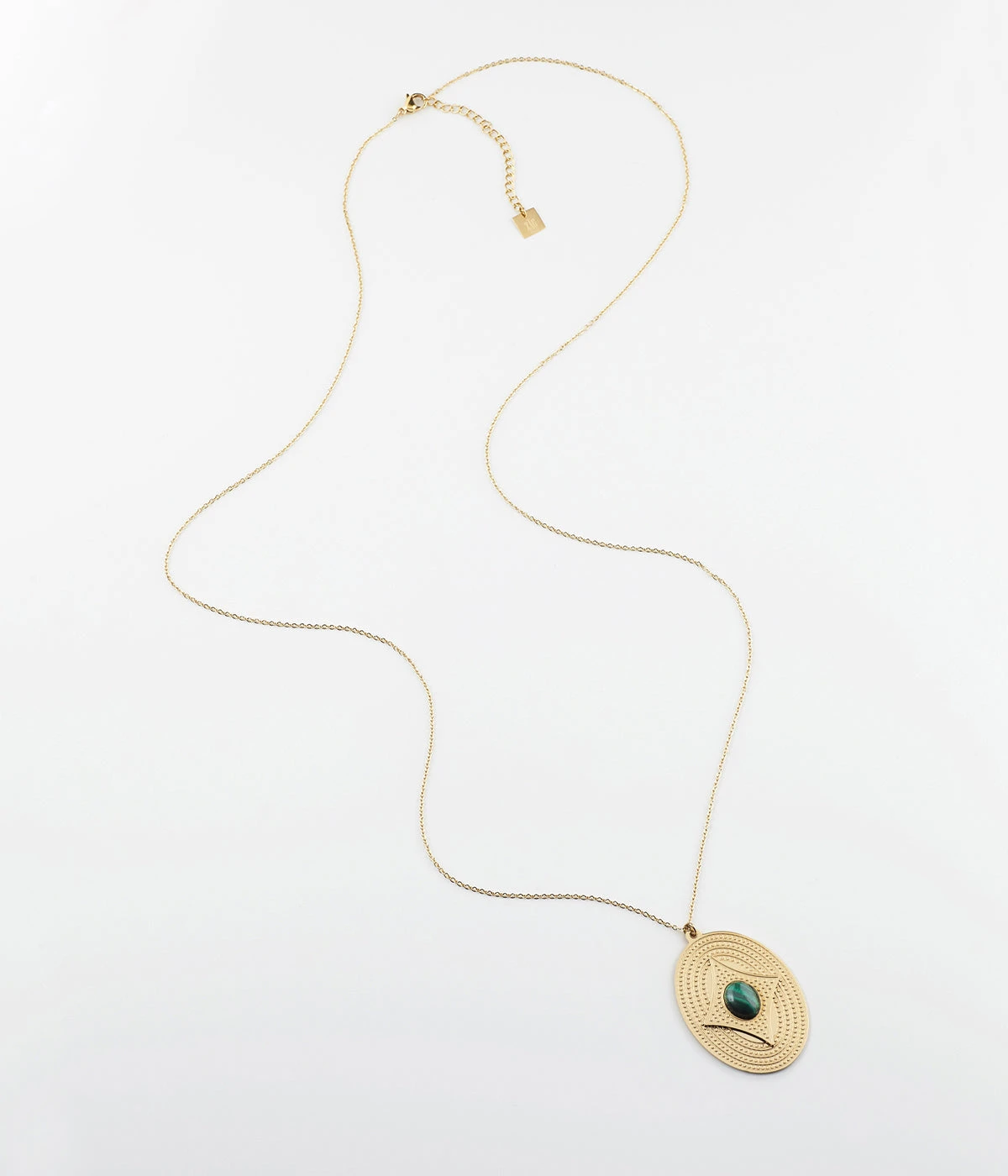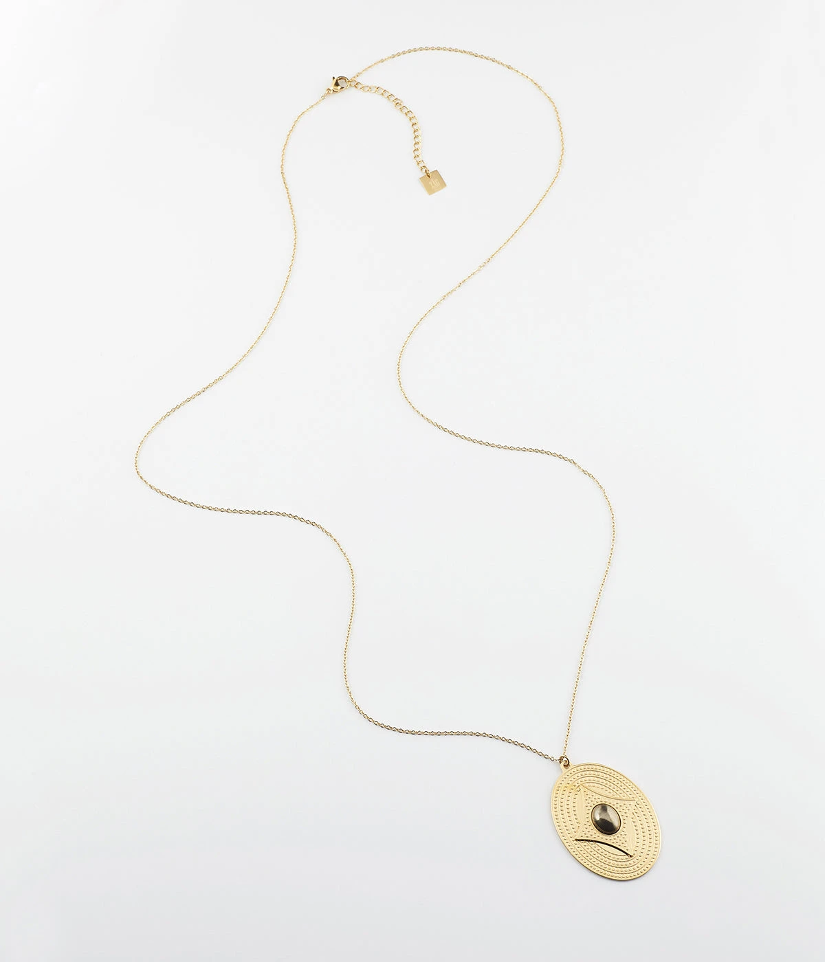 Collier long en acier dorĂ© Ă l’or fin terminĂ© d’un grand pendentif ovale, dĂ©coupĂ© au laser de motifs gĂ©omĂ©triques et serti en son centre d’un cabochon de pierre.