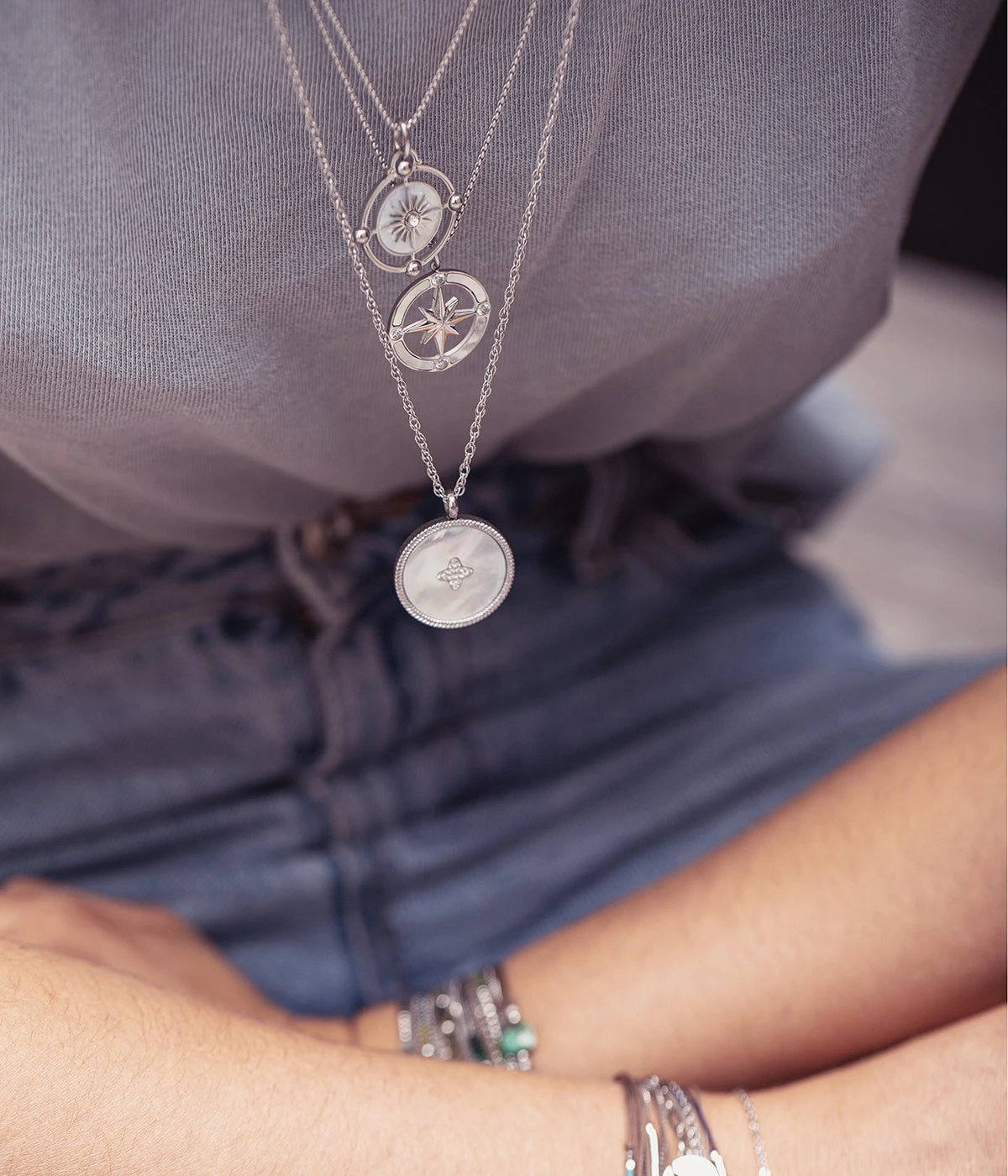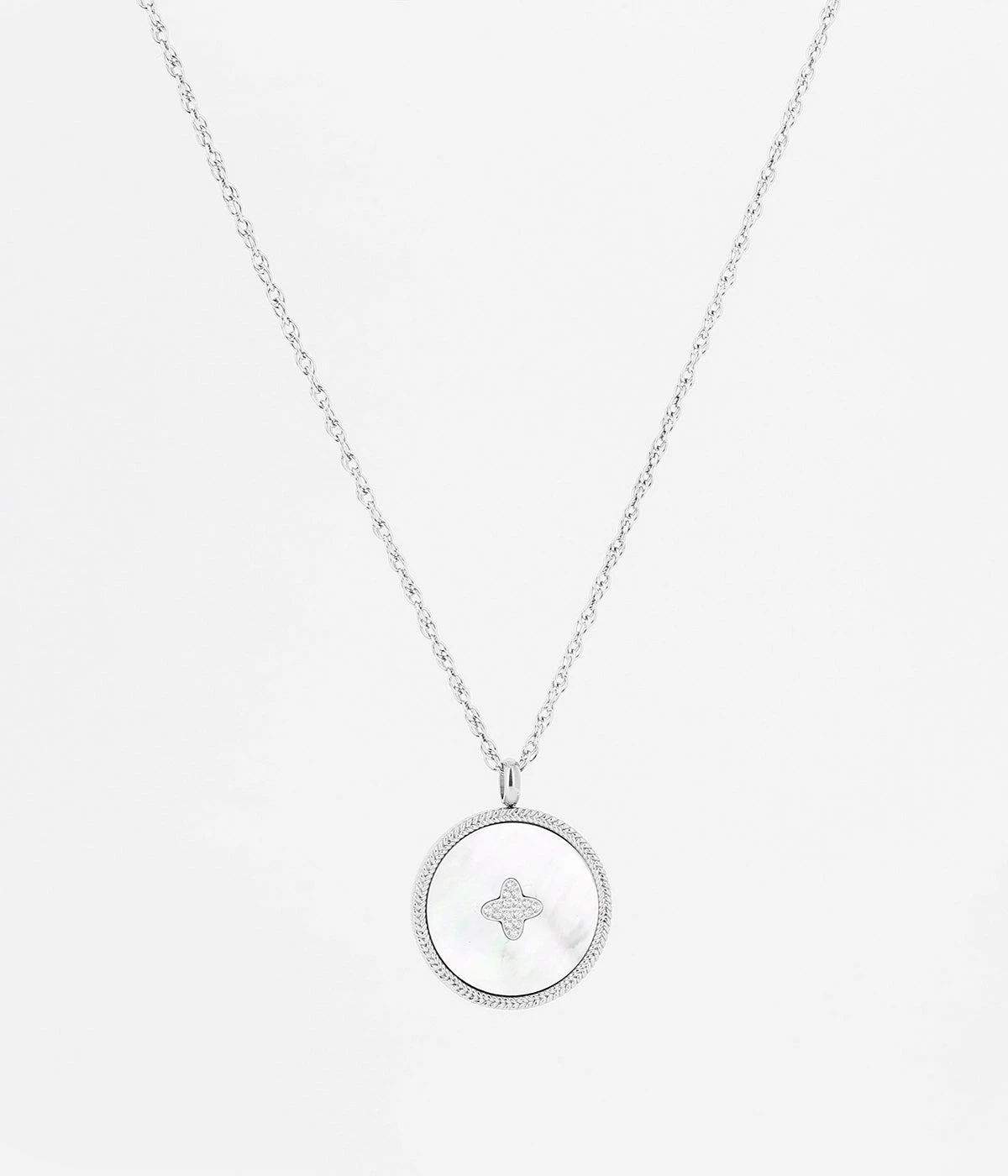 Collier long en acier uni ou dorĂ© Ă lâor fin sur lequel est accrochĂ©e une mĂ©daille de nacre piquĂ©e en son centre dâun motif de fleur en zirconiums.