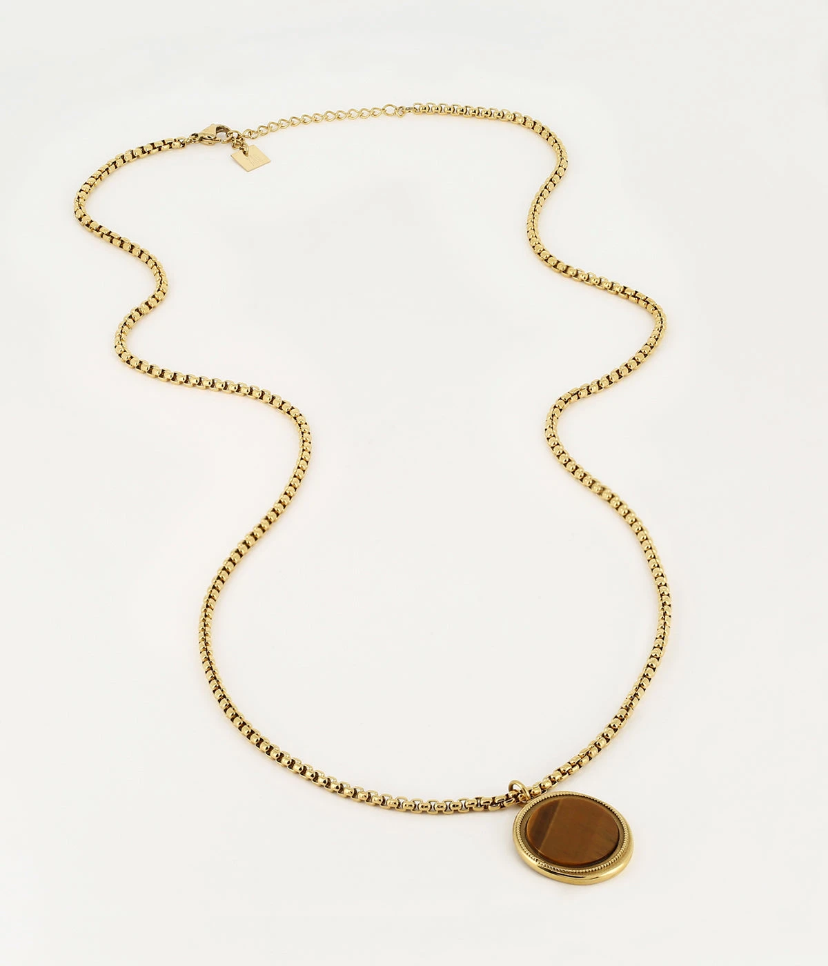 Collier long en acier uni ou dorĂ© Ă l’or fin sur lequel est suspendu un mĂ©daillon possĂ©dant une pierre naturelle.