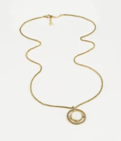 Collier long en acier dorĂ© Ă l’or fin sur lequel est suspendu un pendentif dotĂ© d’une pierre naturelle en son centre et serti de zirconiums.
