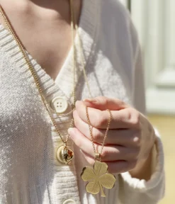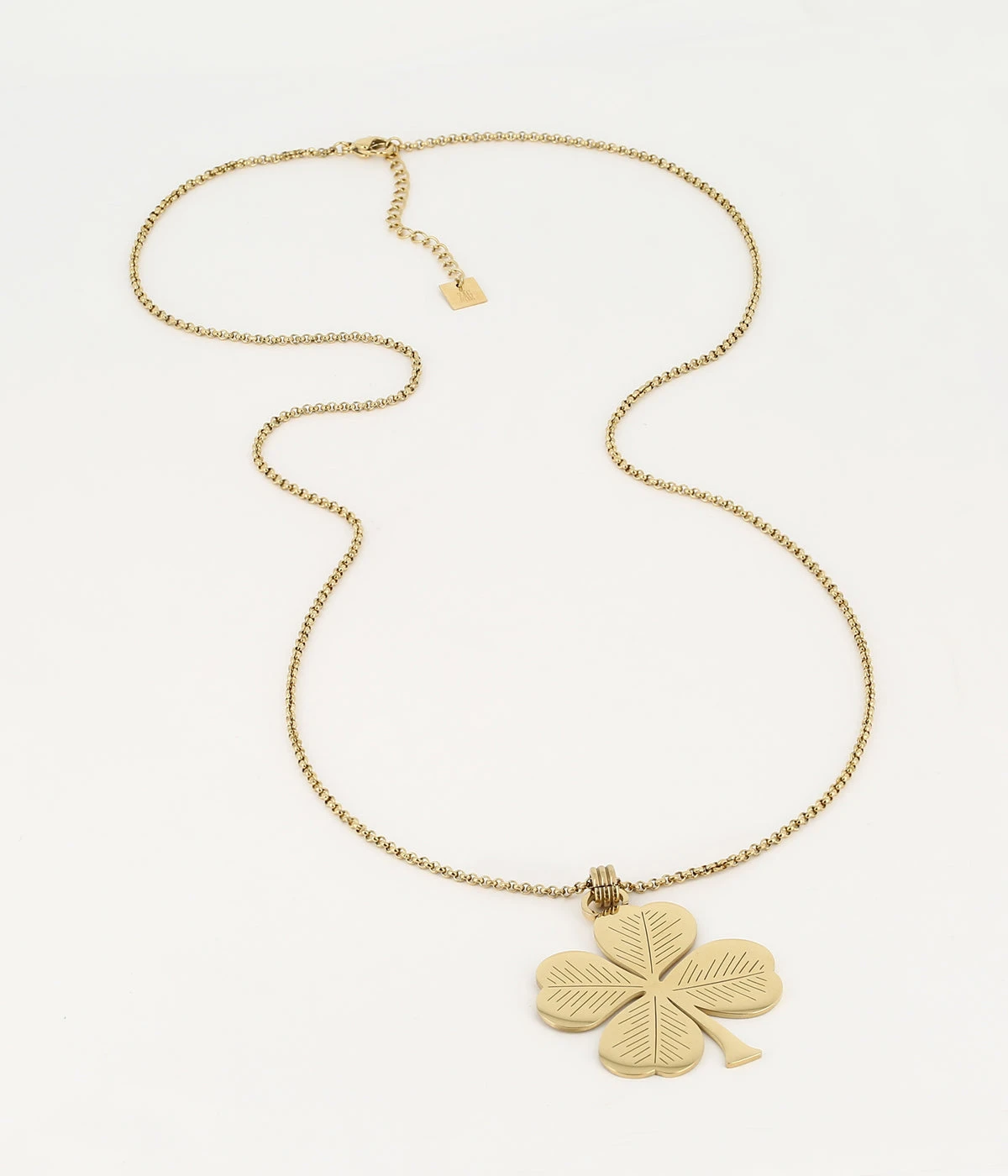 Collier long en acier dorĂ© Ă l’or fin sur lequel est attachĂ© un pendentif reprĂ©sentant un trĂšfle Ă quatre feuilles.